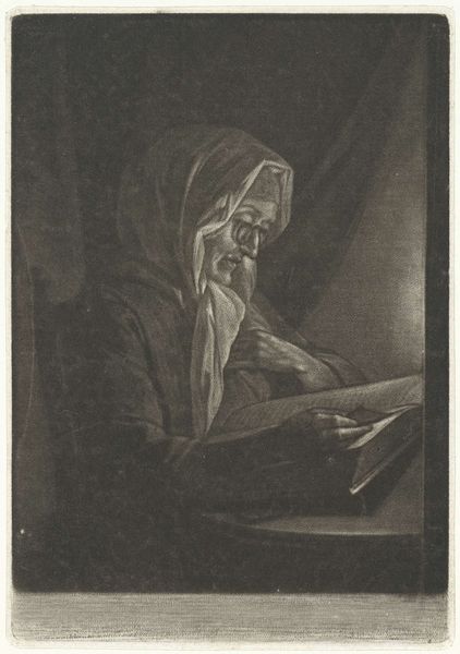 Editor: This is Wallerant Vaillant's "Goudweegster," or "Gold Weigher," an etching dated sometime between 1658 and 1706. I find the details captured through etching on the gold weigher's hands quite impressive. How do you interpret this work? Curator: Look closely at the woman’s clothing and surroundings. It points to the world of material wealth but created through specific production processes. The fabric drapes heavily, almost obscuring the figure. We can see the weight of the cloth, both literally and figuratively. What social class do you think this profession would associate her with? Editor: Probably middle-class, given the nature of gold-weighing, though I suppose those items nearby like a fur throw or a window curtain seem opulent to my eye. It's intriguing. Curator: Exactly. So how might the creation of that class in society be explored through artistic interpretation? Consider what goes into the labor needed for such pieces—from production, circulation, and, eventually, consumption. The art isn’t just “high art” separate from these details but intricately involved with their existence! Editor: So, it's like, through her meticulousness, this piece hints at all the hidden processes it embodies, giving meaning not only to artistry, but to labor, material worth, class… That gives an insight not available when simply seeing the work at face value! Curator: Precisely. Considering how prints themselves were produced in multiples and distributed widely, what effect might it have on labor value? These details provide a fascinating dimension when thinking about materials, art, and the economy of creation. Editor: That makes sense! Considering art as entwined with the means and social aspects of making really unlocks new interpretations. Thanks for your perspective.