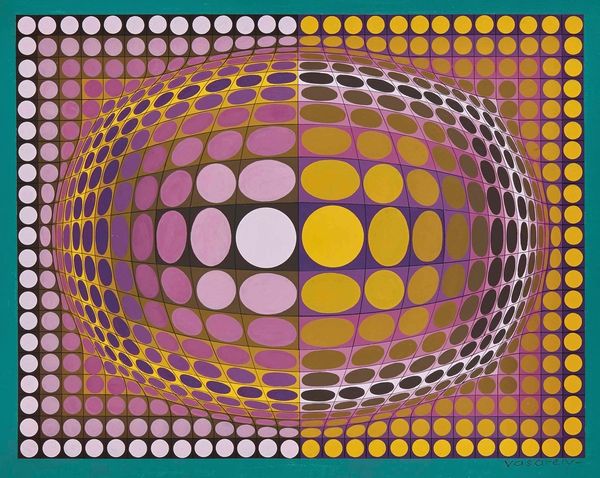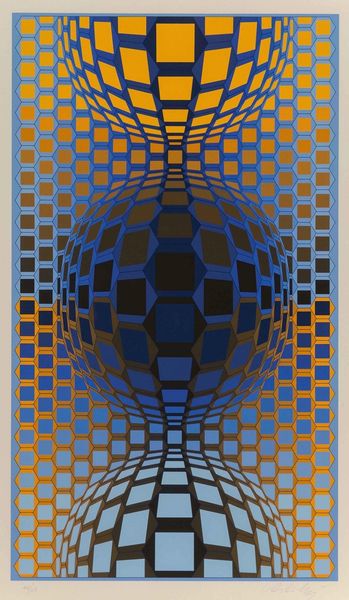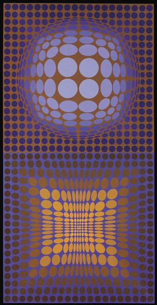 Editor: This is “Bivonn-2” by Victor Vasarely, painted in 1983 using acrylic. It’s a mesmerizing piece with its geometric shapes. It feels like I’m staring into some kind of vortex or optical illusion. How do you interpret this work? Curator: Considering the time it was created, and Vasarely’s focus, it is impossible to look at this without understanding Op Art's context in the latter half of the 20th century. Artists wanted to democratize art by leveraging technological advancements for mass production and distribution. What do you notice about the geometric elements used? Editor: I see the circles, and how the colours kind of vibrate. It makes my eyes move around the piece a lot. Curator: Exactly. The carefully calculated placement of colour and geometric forms were key in his manipulation of the eye. Now, thinking about the social landscape, where does this fit? Consider the rise of technology and consumer culture. Editor: Maybe it reflects how we were becoming more visually stimulated and perhaps even a bit disoriented by the rapidly changing world. Was Vasarely trying to make a statement? Curator: He certainly contributed to a dialogue. Vasarely wanted art to be accessible, and he thought geometric abstraction held the key. This wasn't about personal expression but about creating a universal visual language that could be understood by everyone. Its reproducibility also challenged the art world’s conventions around authenticity. Editor: That’s so interesting! I never thought about it that way, as something that challenges traditional ideas about art ownership. Curator: And it served a function! Op art motifs appeared in graphic design and advertising of that era. It shows how art movements intertwine with the broader culture. Editor: Wow, I see this painting so differently now! Thanks for shedding light on the cultural factors. Curator: My pleasure. Considering art in context helps us understand its meaning beyond just the visual.