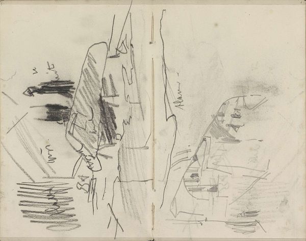 Editor: Here we have George Hendrik Breitner’s "Prinseneiland te Amsterdam, gezien vanaf de Nieuwe Teertuinen," a pencil drawing created sometime between 1892 and 1923. It feels so spontaneous, almost like a fleeting thought captured on paper. What strikes you when you look at this? Curator: Ah, Breitner! He wasn't interested in picture-perfect postcards; he was more about the soul of a place. See how the lines are so raw, almost unfinished? To me, it's like he’s saying, “Here’s the energy, the vibe…don’t worry about the details.” It makes you feel present, doesn't it? Almost like you are walking in his shoes. It almost captures a sort of a melancholic pace that the subject seems to impose. Does it speak to you? Editor: I get that. It’s definitely not trying to be overly precise. It's interesting how much is suggested, but not defined. How does this relate to Impressionism? Curator: Well, you know, Impressionism is all about capturing a moment, that fleeting sensation. But where some Impressionists were chasing sunlight and color, Breitner’s after the atmosphere. Look at how he uses the pencil strokes to convey depth and maybe even the dampness in the air. What mood does this make you think about? Editor: Definitely melancholic. So, it's less about the pretty and more about the…truth? Curator: Exactly. It's that urban realism he was known for, tinged with his own sensitivity. He’s not just showing us a place; he's inviting us to experience it with him. Did anything suprise you about the subject? Editor: I think what I learned today is to appreciate art, one must experience it. Thanks! Curator: It’s been great sharing some time together, these sketches always speak to me. I can come back and experience something different again and again!