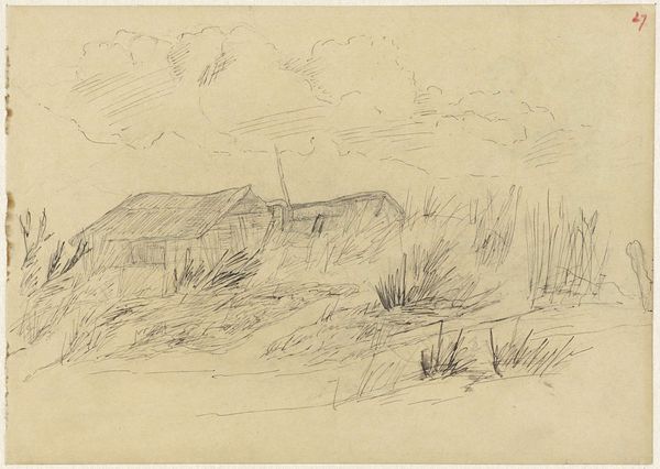 Anton Mauve created this landscape with houses using black chalk on paper. Notice how the composition, dominated by horizontal strokes, evokes a sense of stillness. The artist's subtle variations in pressure create a range of tonal values, from soft greys to intense blacks, defining the simple structures of the buildings and landscape. This piece functions as more than just a representation; it's an exploration of the fundamental properties of the medium. Mauve's approach to landscape aligns with a broader concern of how we perceive space and form. It encourages a contemplation of materiality, questioning traditional notions of representation. Is this a landscape, or is it a study of form and tone? The way Mauve uses strokes and contrast can be interpreted as an attempt to challenge fixed meanings and invite a dialogue between the viewer and the artwork.