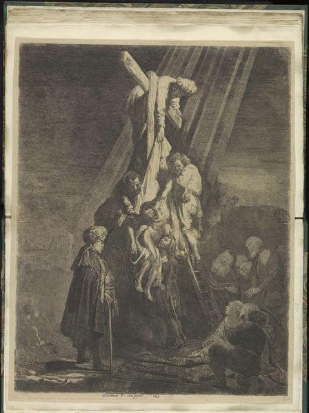 Curator: Before us hangs "The Descent from the Cross" by Moses ter Borch, crafted before 1661. We find it here at the Rijksmuseum, a poignant example of Baroque figuration. The work is skillfully executed in pencil and charcoal. Editor: It feels so immediate, doesn’t it? Raw, almost like witnessing a dream unfold. The gray scale just amplifies the gravity of the scene. It’s not just about bodies being lowered; it's like they're lowering the weight of the world itself. Curator: Indeed. Borch's deployment of chiaroscuro serves a key function, directing our gaze towards the very body of Christ. Light becomes not just illumination, but a symbolic device—a spiritual spotlight, if you will. Consider, too, the architecture within this historical-painting. See the calculated chaos in how it’s composed. Editor: I’m snagged by the humanity of it. Check the reactions of the supporting figures, the almost caricatured expressions, all rendered in the gentlest tones. And did they always have ladders like that back then? Seems sort of flimsy for such a crucial moment in divine history! Curator: The seeming imperfection adds to its affect, pushing past idealized Baroque into palpable human experience. Structurally, that ladder—however anachronistic you find it—creates a vertical axis which then bisects and unifies the whole composition. A compositional anchor. Editor: I get lost wondering about Moses ter Borch’s emotional state when he was making this. Did he labor, or did he flow into it? Did he believe? The more I look at this drawing, the more it hints about what was in the artist’s head. That’s the mystery that grabs me. Curator: The emotional resonance hinges upon the formal execution—line, composition, light. These are not merely representational but expressive vehicles in this narrative painting. The arrangement serves Borch's artistic exploration—one feels its impact precisely because of those techniques. Editor: Exactly! A dialogue on faith expressed via grayscale strokes, a visual hymn humming softly from beyond the ages. So moving to behold this quiet moment of surrender and creative power joined on a single page. Curator: A summation most poetic. I must concede, your insights allow for a profound consideration of Baroque emotion, viscerally connecting us to this poignant historical subject and masterful work of formal beauty.