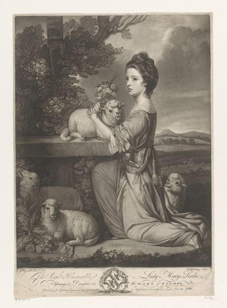 Editor: Here we have "Catherine, Lady Bampfylde," a print from 1779 after a drawing by Thomas Watson, now hanging at the Art Institute of Chicago. She’s posing so elegantly, it's all very graceful, almost dreamlike, and the setting behind her looks theatrical. What do you see in this portrait? Curator: The way Lady Bampfylde is staged within this artificial landscape speaks volumes about the social role of portraiture in the late 18th century. These weren't just likenesses, they were carefully constructed images meant to convey status, taste, and morality. Do you notice anything about her pose in relation to the setting? Editor: She’s kind of perched, isn’t she? Not really part of the landscape, almost like she’s placed there… Curator: Precisely! The pastoral setting, combined with her fashionable attire, creates a dialogue about nature versus culture, and, of course, wealth. What do you think about the contrast between her elaborate dress and the natural scene behind her? How does that reflect the values of the time? Editor: I guess it highlights the importance of appearance and status for women in that era, it's as if their social role defined even their connection to nature. It all feels performative. Curator: Absolutely. Prints like this one made such images widely accessible. This contributes to how such concepts were disseminated, shaping public perception and, indeed, reinforcing social hierarchies. Think of the museum itself as an extension of these display spaces and these social values. Editor: So the image and its circulation helped to perpetuate a specific vision of class and gender. I hadn't really thought about prints working like that before, how their distribution can influence ideas on such a large scale. Curator: Exactly, and it's crucial to understand these works not just as pretty pictures, but as active participants in cultural and political life. Editor: That gives me a lot to think about – it is not just about the sitter; the image, and its availability as a print is as important, if not more.