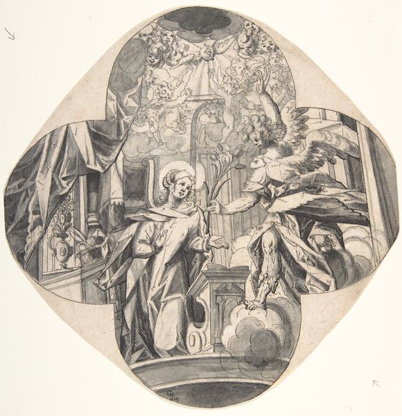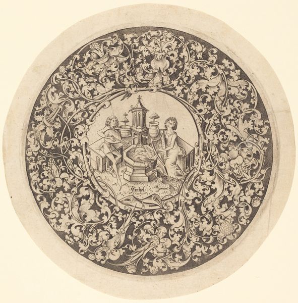 Crispijn de Passe the Elder created ‘Aqua’ in the late 16th or early 17th century as part of a series of circular designs representing the four elements. During this time, the cultural understanding of the natural world was deeply entwined with classical mythology and allegory. Here, Aqua, the element of water, is depicted as a classical nude female figure, a choice that reflects the period's fascination with the ideal human form and its gendered associations. The female figure is surrounded by sea creatures within a decorative border, suggesting both the abundance and the untamed nature of the sea. Consider the perspective of women during this era. Representations like this, while seemingly celebrating the feminine, often confined women to symbolic roles, distancing them from real-world power. Representations such as these invite us to reflect on how ideals of beauty and femininity were constructed and how they influenced women's identities and their place in society. This print, with its layers of symbolism, encourages us to reflect on the relationship between the human and natural worlds. It also highlights the cultural values and gender dynamics of the time.