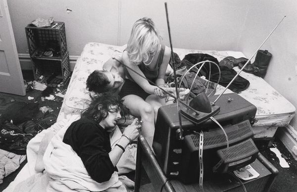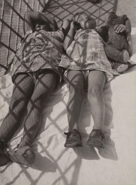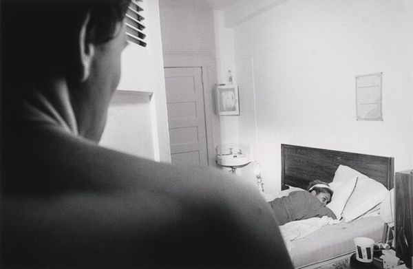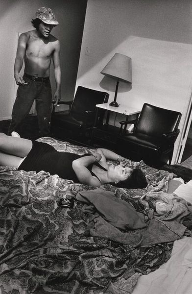 Curator: Jim Goldberg captured this scene, "Freckie, Heather, and Chance, Sunnyside Hotel," back in 1989, using gelatin silver print to freeze this particular moment in time. Editor: It feels instantly melancholic to me, this gray-scale starkness contrasted with such intimate moments… There's an unsettling exposure of vulnerability here. Curator: Vulnerability certainly. Goldberg's work often deals with the fringes of society, shining a light on stories we tend to overlook. The Rosary and band t-shirts feel loaded here in the composition, almost confrontational. Editor: Agreed. And thinking of production, the use of black and white intensifies the rawness. I imagine the photographer amidst the space— what does the act of photographing in this context even look like for the subjects of the photograph? Were these photographs produced on-site, given the immediate material circumstances portrayed here? Curator: The location and moment he has chosen speaks of impermanence, which may even lend to the reading of vulnerability. The subjects, Freckie, Heather, and Chance appear to grapple for affection amidst the chaos— an affection that exists at once, behind a sort of performative persona— an early Gen X love, maybe? Editor: Possibly. Consider the labor involved here, from Goldberg’s initial capture to the development of the print itself. These silver gelatin prints were often used because they could capture detail and tonal range. Are they supposed to communicate the idea that every feeling counts or every labor, perhaps? The photograph feels a bit staged... the labor is a bit suspect? Curator: It certainly plays with a staged sensibility, and that liminality gives the viewer a discomfort— how "authentic" is the artist being about his subjects? But it’s not unusual. The photograph reflects a deeper yearning. Despite the roughness of the surroundings, the symbols— like the rosary beads— still offer glimpses of enduring values that provide meaning even in transient conditions. Editor: Right. And while the composition highlights raw, interpersonal realities, the medium of photography is almost complicit in aestheticizing poverty… Curator: Indeed, the tension adds to the photograph’s strength, wouldn’t you agree? Editor: Certainly does. Food for thought— considering image, moment, subjects. Curator: The layers embedded offer reflections on the world around us all.
