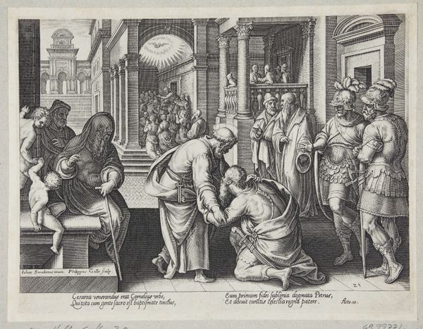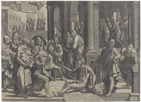 Curator: Cornelis Cort created this engraving before 1601, titled "Christus, op 12-jarige leeftijd, in discussie met de schriftgeleerden," which translates to "Christ at 12 years old, in discussion with the scholars." Editor: It's amazing how Cort captures such dynamic energy with just lines and shading. The scene feels tense; the composition tightly packs a group of men around a radiant, youthful figure. Curator: Absolutely, and placing it within the historical context of printmaking, we can consider its wide dissemination. How did printed images impact religious and intellectual discourse during this period? Editor: We see echoes of that dynamic power play in modern conversations too, whether regarding age, gender or who controls the narrative. I mean, who gets to question the establishment? Here, a child challenges presumed authority. Curator: Right, the piece really provokes questions of power and representation, especially regarding age and wisdom, challenging traditionally hierarchical systems of learning and the male dominated sphere of religious authority. Look how Christ’s androgynous presentation also serves to complicate identity! Editor: You bring up fascinating points! But stepping back, I’m struck by the architectural details, from the classical sculptures to the arches. They emphasize how the Church often embeds its power in grand architectural statements. Curator: And this deliberate architectural embedding reinforces specific ideologies, connecting with socio-political structures and power dynamics prevalent in art during the time. The Church’s financial support, its role in promoting specific narratives. How did institutions shape not only production but public perception of religious art? Editor: That connection, where art acts almost like state propaganda through controlled patronage and message framing, really makes me think about how the establishment used images to justify societal structures. Curator: By looking at the socio-cultural impact and politics inherent in Cort's piece, we have the chance to delve deeper into intersectional perspectives. Editor: It's truly compelling to reflect how works like this acted not just as religious icons but as active participants shaping wider societal ideologies.