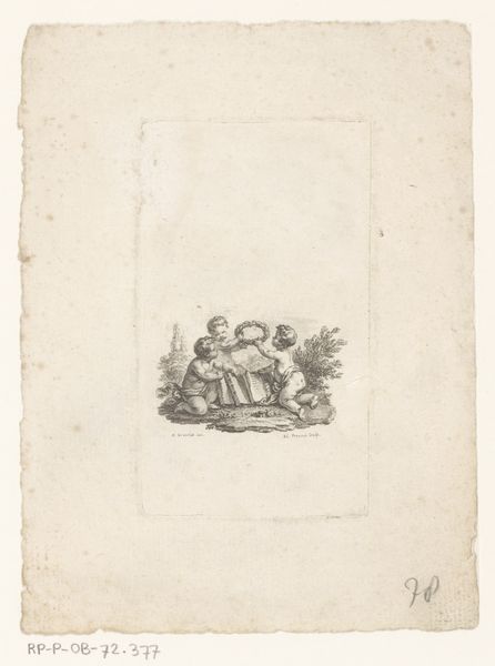 Gerhard Ludvig Lahde created this oval vignette featuring two boys and a woman in a forest, sometime between 1765 and 1833. Set against the backdrop of late 18th and early 19th-century Europe, this piece subtly captures the era's social dynamics. We see a tension between the performance of childhood innocence and underlying power dynamics. The vignette invites us to consider the roles assigned to individuals based on age and gender, and it subtly reflects the expectations and constraints placed upon them. The woman, likely a caretaker or mother, looms in the background. The playful tussle between the boys isn't merely a scene of youthful exuberance; it’s also a study in the making of masculinity. As one boy seems to dominate the other, we might reflect on how power and submission are introduced early in life. Lahde’s work stops short of overt commentary, but it gently directs our gaze toward the societal structures that shape our identities. Ultimately, this vignette is a quiet yet potent meditation on the formative years and the silent lessons learned within the familial theater.