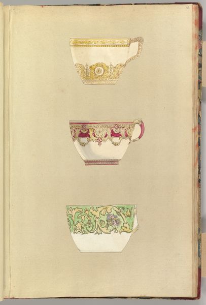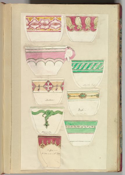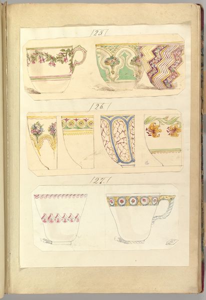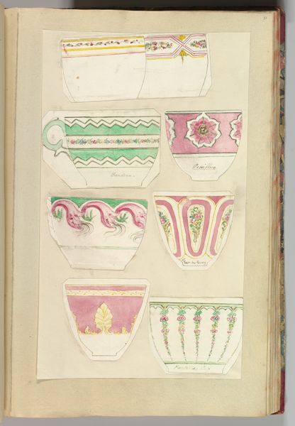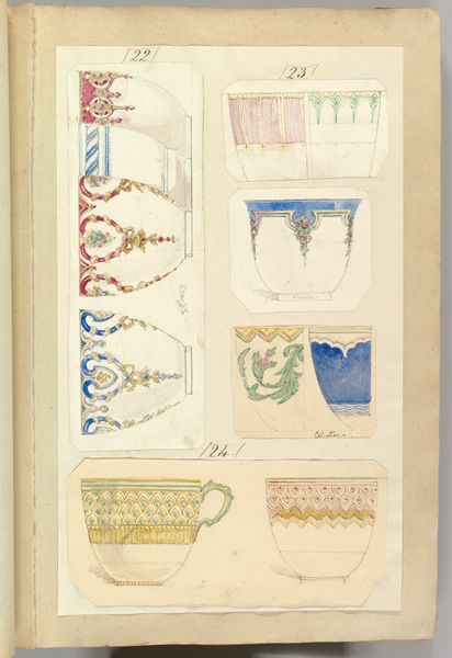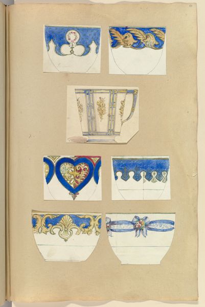 Editor: Here we have Alfred Henry Forrester’s "Seven Designs for Decorated Cups," created between 1845 and 1855. It’s a watercolor and coloured-pencil drawing showing different ideas for cup designs. I'm immediately struck by how ornate and impractical these seem for everyday use. What catches your eye about these designs? Curator: Oh, impracticality is part of the charm, isn't it? Like a porcelain unicorn grazing on a velvet lawn – purely decorative, bordering on fantastical. They almost feel like illustrations from a fairytale about a tea party in Wonderland. The deep blues, juxtaposed with the white porcelain, it’s pure visual confectionary. Editor: A fairytale, that’s interesting! So, were these ever intended to actually be made into real cups, or were they more of an artistic exercise? Curator: I suspect it was a bit of both. There’s a clear interest in current fashions in porcelain, and Forrester was likely pitching design ideas, hoping one would stick. It's worth considering the influence of the industrial revolution at this time; these kinds of ornate decorations become more readily possible with new manufacturing techniques, right? Also, do you notice how contained they are, within that larger page? Like captured dreams. Editor: Yeah, I do see that. Almost like a little mood board. They feel precious, now that you mention them being contained. Curator: Exactly! Each cup a little jewel of design. Thinking about that larger page, to me, becomes an intimate window into Forrester’s imagination, which is now forever preserved within the Met! Editor: Well, that definitely reframes how I see these designs. I was so focused on their surface appearance before. Curator: Isn't that the joy of it, though? We both looked at the same designs, took them on an adventure, and they each revealed new aspects of themselves to us.