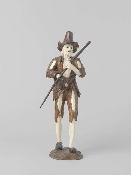 Curator: Welcome. We are standing before "Bedelares met kind," or "Beggars with child" by Simon Troger, dated before 1768. It’s a compelling baroque sculpture fashioned from wood. Editor: Wow, that hits hard. She's so vulnerable, yet there’s a quiet strength in her posture. The gaunt face and ragged clothes, you know, they tell a story of hardship etched in every groove. It is difficult to witness something like that. Curator: Indeed. Notice the artist’s deliberate use of contrasting light and shadow to accentuate the contours of her face and clothing. The linearity in the cascading tears of wood around her, creating a sort of halo, further draws us in to examine the condition of this woman. What about the figure on her back, almost like an angel. Editor: I love the term cascading tears, what a poetic, elegant phrasing. It gives a movement to the work. But that child seems… detached. Almost more like an extra weight, a stone she carries along, more than part of her. The sculpture hints at burdens unseen, societal neglect maybe. And this walking stick of hers seems both support and weapon, no? It can fend danger off...but also signal hardship. The question is: did Troger mean to idealize such a vision, to simply show what happens, or something more complex. Curator: The intentional juxtaposition of poverty and implied religious iconography through that almost angelic infant suggests a commentary on charity, on those often overlooked in society. Considering the historical context of Baroque art with its ornate detailing and theatrical displays, Troger subverts expectations. He simplifies, perhaps challenging the social norms of his time. Editor: He simplifies while being ever-so complex, it’s this contrast that I am starting to admire so much. This woman's clothes reveal just as much as they cover! It brings a raw immediacy to the piece... and makes me question my role as observer. We observe this figure but, at what expense. Is it just entertainment, or a real questioning about values. Curator: Yes, an acute observation. The raw materiality of the wood itself speaks to the harsh realities faced by the underclass, prompting introspection on the viewer’s own position. Editor: A thought-provoking dance between observer and observed then. It brings so many thoughts... Troger achieves a poignant moment frozen in time. This is far from what its mere materiality represents!
