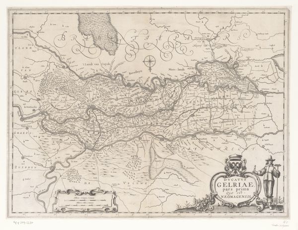 Editor: This is an old map, "Kaart van het graafschap Zutphen," made sometime between 1617 and 1648 by an anonymous artist. It’s an engraving, so black ink on paper. I'm struck by how detailed it is and I wonder how accurate it was at the time. What can you tell me about what's depicted here? Curator: Accuracy is interesting; these maps weren’t always about literal geographical precision. Look closer—do you notice anything about how power might be represented here, not just geography? Editor: I see small illustrations of buildings or towns that maybe signify something important? Curator: Exactly! This map presents not just space but also a worldview, prioritizing certain settlements and territories. Consider Zutphen's location. What can it tell you about Dutch identity in a period marked by the Eighty Years' War and nascent nationalism? Editor: So it's a projection of political power through the guise of a simple map. Curator: Yes. And look at the landscape itself, the carefully rendered forests and rivers. Who benefits from these representations of the region’s natural resources? Editor: Maybe wealthy landowners, those controlling trade routes...It gives the sense of surveying a space that can be owned, exploited. Curator: Precisely. How does knowing this affect your reading of the artwork now? Editor: I see it less as an innocent depiction and more as an assertion of dominance, creating a visual order reflecting the priorities of a specific class and political power. Curator: Exactly. Now we might think about the agency of the artist, the choices made. Each line holds intention. Editor: I guess I see that this map contains multiple layers: geographical, artistic, political, even socioeconomic! Curator: Indeed. Now you are truly seeing the map.