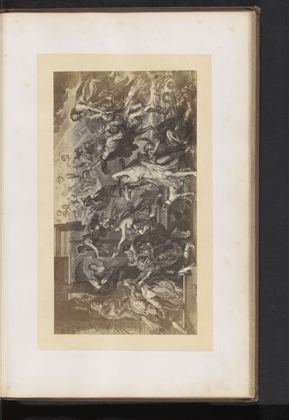 This is a photographic reproduction by Edmond Fierlants, made sometime in the 19th century, of Antoine Wiertz's painting "In familie VI: Gestorven voor het vaderland". The photograph captures the dramatic chiaroscuro and dynamic composition of the original painting. Notice how Fierlants’s lens emphasizes the theatricality of Wiertz's vision, where the figures emerge from a dark background into stark light. The upward surge of bodies, combined with the textural interplay of light and shadow, lends the image its emotional intensity. This photograph doesn't just reproduce an image; it reinterprets the original painting’s themes of sacrifice and familial grief through the photographic medium. The photograph invites us to consider how meaning is constructed through both the original artwork and its subsequent reproduction. It questions the stability of representation itself. How does the shift in medium—from paint to photography—alter the reception and understanding of Wiertz's patriotic narrative? This interplay between the original and its copy reveals photography’s power to not merely replicate, but to actively reshape our engagement with art and history.