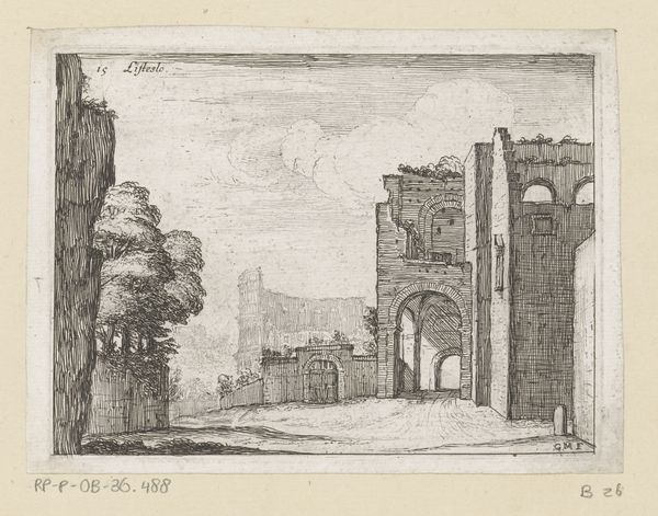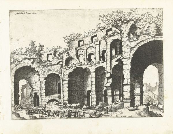 Editor: Here we have Giovanni Battista Mercati’s “Resten van het Colosseum te Rome,” from 1629. It's an engraving, a glimpse into the past. I'm struck by the decay, this tension between the grandeur of the Colosseum and its ruinous state. It feels almost…melancholic. What do you make of it? Curator: Melancholy, yes, that's a perfect starting point. The lines feel almost like whispered secrets of history. Mercati wasn't just showing us stone and archways, was he? I wonder if he was grappling with time itself. Consider the figures he places within the ruins, tiny in comparison—how does that affect our understanding of power, of civilization? Editor: It's a stark contrast! They seem so insignificant against the scale of the ruins. Almost like nature is reclaiming what was once theirs. Curator: Exactly. Think of the Baroque period: full of drama and heightened emotion. And yet, here’s Mercati choosing quiet contemplation, allowing the Colosseum’s decaying beauty to speak volumes. It makes you wonder what other meanings it tries to whisper us…almost a warning that everything turns into dust. What stories do *you* see swirling in the Roman sky above? Editor: A story of decline, but also resilience. The ruins are still standing after all those centuries. It's like a memento mori and celebration of human achievement all rolled into one. Curator: Beautifully put! It's in that very duality, the interplay of grandeur and decay, that the drawing finds its voice. A ruin isn't just what is lost; it's also what remains, stubbornly, defiantly, whispering stories of empires to anyone who'll pause to listen. I learn the whispers when seeing the decay in front of the vast skies as if its ghost haunts us forever. Thanks for making me pause and rethink. Editor: My pleasure, this gave me another perspective. Now, I have some pondering to do myself.