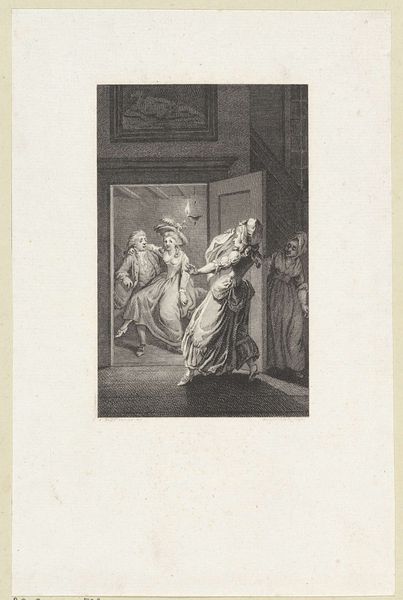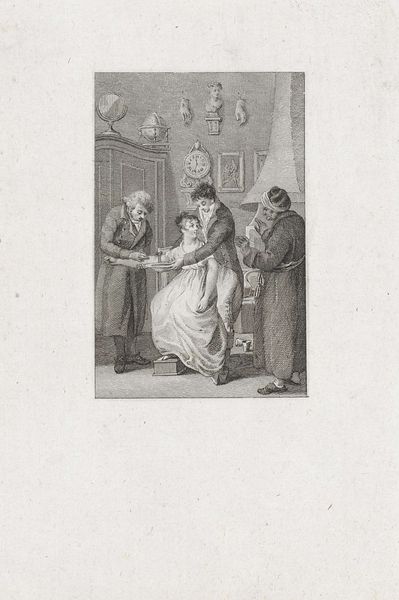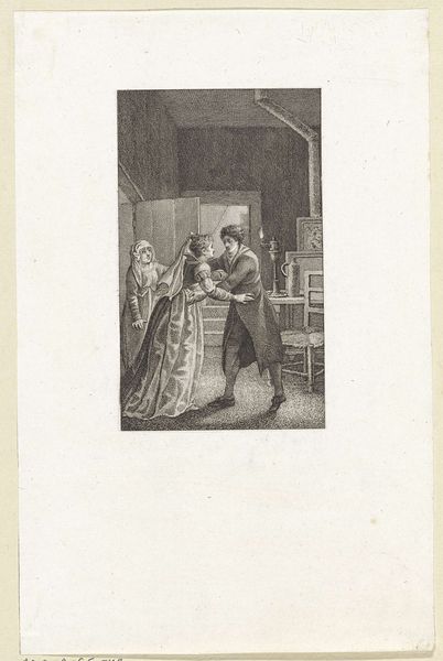 Editor: Here we have Reinier Vinkeles' "Two Ladies Conversing in Front of a Market Stall," an ink and pencil drawing from 1806. It feels like a glimpse into a different world. What stands out to you about the composition and execution of this work? Curator: Note the careful arrangement of forms within the pictorial space. The figures are situated asymmetrically, creating a dynamic tension, which contributes significantly to the image’s structural integrity. The varying tonal values are noteworthy; Vinkeles' controlled use of line and shading delineate forms effectively. What relationship do you observe between line quality and spatial recession? Editor: The lighter pencil work seems to be used for objects further back, creating depth. Is that intentional, or just a result of it being a preliminary sketch? Curator: The artist is employing a clear understanding of linear perspective, strategically varying the density and weight of the lines to guide the viewer's eye through the composition. Notice, too, how the precision of line contributes to an overall sense of order and refinement, a characteristic tenet of Neoclassicism. How might we interpret the deliberate simplification of forms in this context? Editor: I guess it’s moving away from the ornate details of previous periods, prioritizing clarity and form. Curator: Precisely. Consider also the artwork’s material presence: the intentional deployment of aged paper with a fine weave invites a reflective contemplation of artistic process itself. Does engaging with these material properties heighten your appreciation for the drawing? Editor: It does. Seeing the subtle textures adds a layer of intimacy to the piece. I've definitely gained a deeper appreciation for the elements that come together to give the drawing its particular quality. Curator: Indeed. A close analysis reveals not merely an illustration, but a calculated manipulation of formal elements working together in perfect harmony.