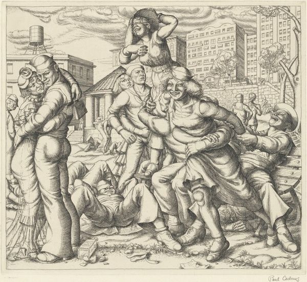Curator: This is an engraving entitled *The Martyrdom of Saint Martina at the Stake* by Antonio Gherardi, likely created between 1654 and 1702. Editor: Immediately, I’m struck by the sheer number of figures packed into the frame, all rendered with incredibly fine lines. There's a dynamic tension created by the contrasts in posture and emotion, like looking at the layers in a raw textile. Curator: Precisely. Gherardi masterfully uses line to construct this dense narrative. We see the baroque fascination with drama and movement. Note how the lines contribute to an overall feeling of controlled chaos. Compositionally, observe the strategically placed columns framing the unfolding execution of Saint Martina, almost forcing us to participate in the drama. Editor: I keep thinking about the copper plate itself. How many hours did it take to meticulously incise these lines to render this image? Also, what sort of acid bath and papers where involved in the multiple states of printing it until he felt that he had reproduced correctly what he had on mind? Thinking about the physical labour brings this supposed elevated act back to its corporeal production. Curator: It’s an interesting point. You focus on the means of production and materiality, highlighting the labor intensive craft, rather than the spiritual content. But Gherardi employs specific visual codes related to heroism and martyrdom—note Martina’s calm face amidst the turbulence—a classical rhetorical device in representing saints being tortured. The lines in her garments suggest some sort of classical figure while she remains serene in her piety, creating the allegorical figure. Editor: The contrast, even in the line weight alone, really brings out her isolation within the crowd, this supposed act of piety. What a material performance! Her act solidifies in front of our very eyes—ink, acid, a martyr, printed! Curator: Well, looking at the architecture— the meticulous detailing of each building or arch—we appreciate Gherardi’s command of perspective and line as tools of ideal representation and religious devotion. Editor: Yes, and I keep being mesmerized by all these thousands of small traces that have been produced and distributed to a faithful public for decades. Thinking about Gherardi’s own investment of physical labor on it just opens this can of questions... Curator: An utterly remarkable convergence between craft and devotional representation, isn't it? Editor: Indeed, between materials and sacrifice.