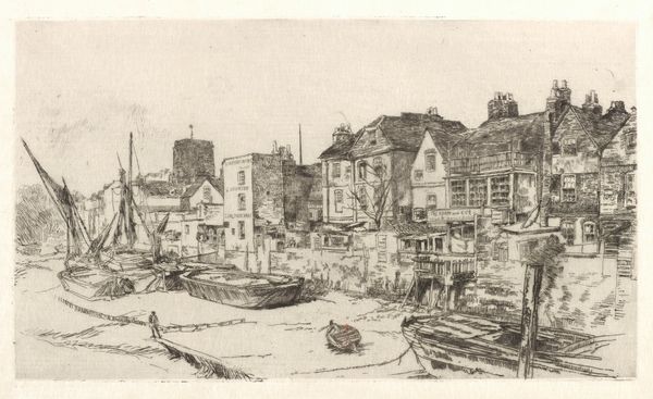 Curator: Whistler's "Thames Police," a work residing here at Harvard Art Museums, gives us a glimpse into 19th-century London. What is your immediate impression? Editor: It feels incredibly intimate, almost like a stolen glance. The delicate etching lines create a hushed atmosphere, focusing on the working waterfront. Curator: The Thames was the lifeblood of London. Whistler, drawn to its industrial pulse, captured the raw, unvarnished reality of the dockworkers and the river police who patrolled it. Editor: The material choices speak volumes. Etching, a readily available medium, democratized art-making. Its connection to print culture enabled wider distribution and engagement. Curator: Exactly. Whistler challenged the established art world by depicting everyday scenes and embracing the print medium. He elevated these subjects to fine art, inviting viewers to contemplate the beauty in the mundane. Editor: And think about the labor involved! Every line painstakingly etched, reflecting the hard work depicted in the image itself. It makes you consider the relationship between artistic labor and the labor on the docks. Curator: Indeed. The image reminds us that art isn't created in a vacuum, but is responsive to societal forces, shaped by the very world it reflects. Editor: It's fascinating how this small print opens up so many larger conversations about art, labor, and society.