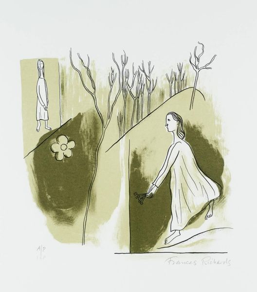 Curator: Here we have Frances Richards' lithograph "Childhood II," part of the Tate Collection. Doesn't it feel like a memory, somehow faded and ethereal? Editor: It does. The muted greens and the stark white figures give it a very dreamlike quality. I wonder about the floating figure in the background... Curator: Perhaps a representation of the boundless imagination of childhood, unburdened by gravity. Richards, working amidst the mid-20th century's socio-political upheavals, often explored themes of innocence and vulnerability in her art. Editor: So, a conscious effort to reclaim an idea of purity, perhaps? The dream figure juxtaposed with these two grounded figures definitely creates tension. Curator: Yes, a tension and a longing. And the seemingly simple lines and shapes belie a complex emotional landscape, don’t you think? Editor: Absolutely. It’s deceptively simple, yet it resonates with so much depth. Makes you think about what we lose as we grow.