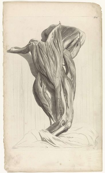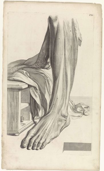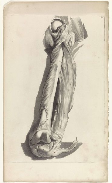 Editor: Here we have Pieter van Gunst's "Third Anatomical Study of the Muscles of the Left Thigh," made around 1685. It's a drawing using graphite and pencil on paper and held at the Rijksmuseum. The level of detail is incredible. What strikes me most is the clinical, almost detached, way of looking at the body. What do you make of it? Curator: It is striking, isn't it? Consider that this level of anatomical drawing coincided with significant shifts in how the body was perceived, moving away from purely religious or philosophical interpretations to more scientific investigations. This image is laden with symbolic meaning – each muscle meticulously rendered, less as flesh and blood and more as components in a rational system. What do you think such detailed anatomical representations gave permission for in the cultural imagination? Editor: I suppose it helped pave the way for a less mystical, more empirical understanding of life... more rational maybe. Curator: Precisely. Think about the historical context: the rise of scientific societies, the Enlightenment brewing. Dissection was becoming more acceptable, although still fraught with social and religious implications. In rendering the body so objectively, even unemotionally as you noticed, the image lays bare a cultural narrative – one of man’s growing ambition to dissect not just bodies, but also the mysteries of existence itself. Are there specific elements that strike you as particularly evocative, viewed in this context? Editor: I think how it lacks personality - like this is a diagram, and how powerful the idea of dissecting things really is. Curator: The pursuit of understanding and control… I think that's key. It's fascinating how this detailed, objective style actually reveals a lot about cultural shifts and intellectual ambitions of that time. I learned to think of medical illustrations as records of their time just now! Editor: Agreed, I'll definitely never see anatomical drawings the same way again! Thanks for your insight!