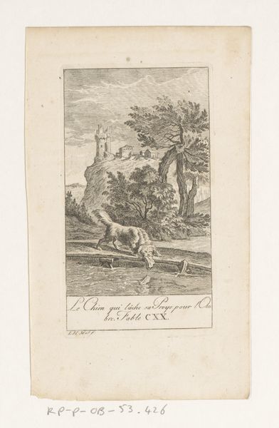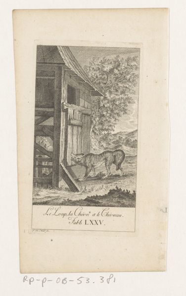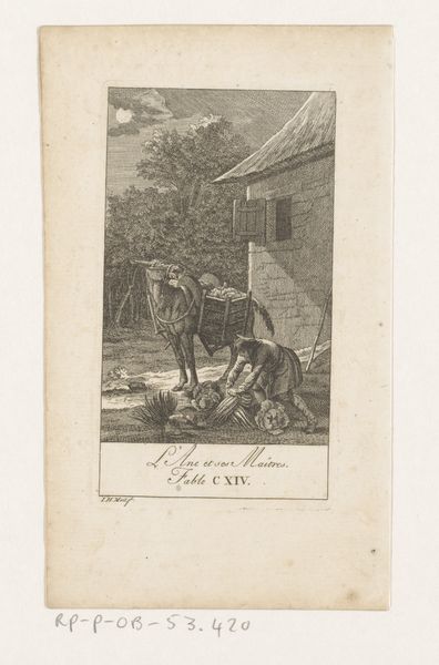 This print, “Fable of the mule boasting of his origins,” was made by Johann Heinrich Meil the elder, likely in the late 18th century. It's an etching, a printmaking process that uses acid to create lines in a metal plate, which is then inked and pressed onto paper. Look closely at the image. The fineness of the lines speaks to Meil's mastery of the etching technique. He’s using it here to illustrate a pointed social commentary. Mules, being hybrid animals, are famously sterile – a metaphor for the futility of social climbing. The landscape in the background, with its prominent windmill, hints at the economic realities of the time. Windmills were crucial for grinding grain, and this alludes to the labor and industry that underpins society. The mule's vanity is thus set against the backdrop of real work and productivity. Meil, in this small print, is inviting us to consider the material basis of social status.