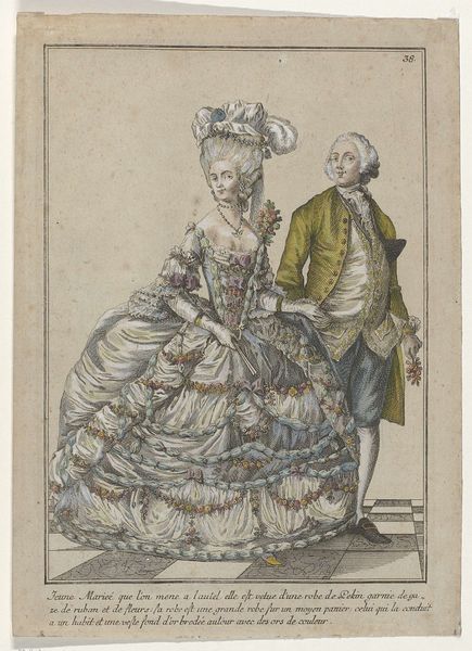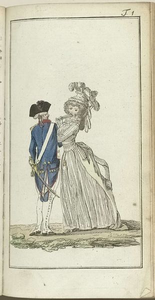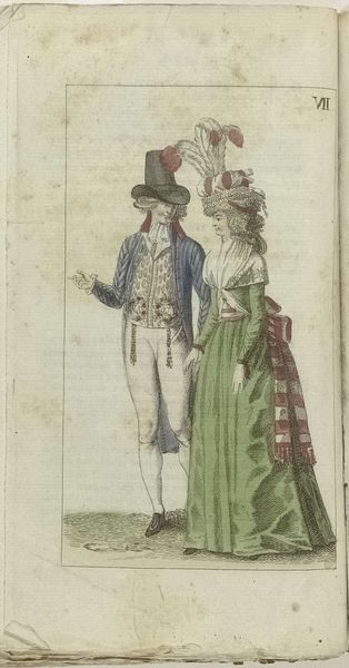 This fashion plate, made around 1794, showcases the height of late 18th-century fashion through an unnamed artist's eyes. Note the extravagant use of feathers adorning the woman's head, a motif that stretches back through history. Feathers, symbols of lightness and elevation, have graced humanity since ancient times, from the headdresses of indigenous shamans to the winged helmets of classical gods. Their presence here, however, speaks to a more recent aspiration: the aristocratic longing for transcendence amidst societal change. The layered meaning of feathers shifts through history, reappearing in new guises, reflecting the collective subconscious anxieties and aspirations of different eras. The flamboyant plumage worn during the French Revolution, for example, might signify not just status but also a fleeting, desperate attempt to reach for the heavens as the old order crumbled. The emotional resonance of such displays engages us still, reminding us of the cyclical nature of human striving and the perennial quest for meaning.