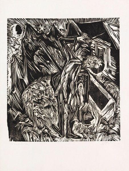 Editor: This is "Page 19, State I" by John Walker. I see a tumultuous scene, perhaps figures in conflict. What historical or social narratives might this piece be reflecting? Curator: Consider Walker's engagement with post-war anxieties. The fractured forms and stark contrast echo the instability of identity in a world grappling with trauma and displacement. How do you see this reflected in the composition? Editor: The fragmented figures could symbolize a breakdown of traditional power structures, perhaps? Curator: Exactly! The lack of clear definition challenges conventional representation and invites us to question established norms and the construction of self. What does that suggest to you? Editor: It makes me think about the role of art in deconstructing societal expectations. Thanks, that's insightful.