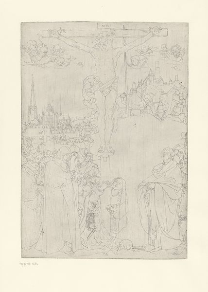 Editor: So, here we have Durer's "The Crucifixion," created sometime between 1485 and 1600. It's a pencil drawing, and even in this sketch form, the scene is intensely moving. It really conveys a sense of suffering, but I'm also curious about its place within religious and social narratives of the time. What strikes you most when you look at it? Curator: What stands out is how Durer uses a universally recognized symbol of suffering and submission to possibly critique existing power structures of his time. We're looking at a period where the Church held immense social and political sway. Durer was operating in a society grappling with immense political and economic shifts. How does the positioning of the figures—the powerful onlookers versus those mourning at the foot of the cross—speak to you? Editor: It’s like he's highlighting the contrast between the observers in their fine robes and the emotional grief of the mourners. Curator: Exactly. And who were the mourners typically? Who was subjected to systemic injustices within religious dogma? Were there those on the fringes, denied full humanity under the very laws claiming divine origins? Durer subtly hints at those silenced voices, creating an image that serves as a quiet indictment of injustice sanctioned under the guise of faith. Editor: I hadn't thought about it in those terms. It's easy to just see it as a straightforward religious scene, but you're right. The artist is clearly highlighting the faces of both the powerful and the suffering, who were possibly very powerless in real life. Curator: Precisely. How the artist's composition provides not just an image for reverence, but becomes a site for questioning authority, inviting empathy and solidarity for those on the margins. So much so that this single sketch carries a poignant discourse. Editor: That's incredible. I'll definitely be looking at Durer—and art from the Renaissance in general—with fresh eyes from now on. Curator: Absolutely. Remember, art isn't made in a vacuum. It can hold multiple layers of critique and meaning.