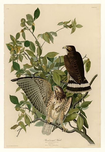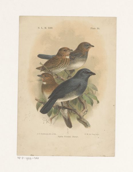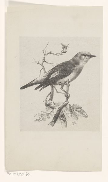 Curator: These little birds look so serious. Editor: Indeed. Here we have "Two Birds on Branches" by Theo van Hoytema, created sometime between 1878 and 1917. The artist used coloured pencils to render these avian subjects, and it now resides here at the Rijksmuseum. Curator: Colored pencils, huh? They have such a gentle, almost shy quality. I love how he captures the birds’ stillness; there’s no frantic energy, just quiet observation. It's almost like a mindful moment, capturing not only their likeness but also the soft murmur of nature around them. What did catch your attention immediately, looking at the drawing? Editor: Well, considering Hoytema's links to the Japonisme movement, I think it is useful to consider how the composition and use of space demonstrate these leanings. Notice the placement of the birds; they dominate the picture plane while also sharing space in an almost perfectly balanced fashion. These sorts of choices highlight formal arrangements that, for me, at least, become far more crucial than pure representation. Curator: Yes, yes... but did you also feel an emotional pull? Beyond technique, it's fascinating how he captures something essential. Looking closely, the branch that one of the birds is perched upon almost melts away behind the bird, which, as it emerges from this botanical embrace, lends it a quality of fragility. As the leaves almost threaten to obscure these birds in the natural surroundings, does this make you also question the role humans have to play? How well are we respecting such creatures and nature as a whole? Editor: Well, although I find myself unable to draw any strong emotional context out of the drawing, I will admit that the choice to make two observational notes next to each of the drawings could easily signal the artwork as more than simply an image—it's a biological study as well. Curator: It’s funny how art can do that, isn’t it? Open our eyes to the beauty and urgency around us, one quiet bird at a time. Editor: A fascinating combination of realism, Japanese influences, and, yes, maybe even a touch of environmental consciousness. Let's move on...