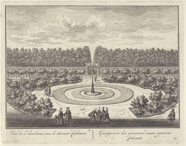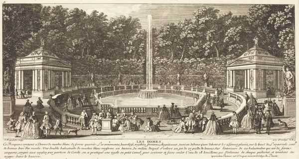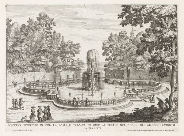 Jean-Baptiste Rigaud created this print, L'Obelisque, using etching and engraving techniques. These processes, reliant on skilled labor, allowed for the mass production of images, fueling a growing market for visual representations of luxury and leisure. Notice how the stark lines of the engraving emphasize the geometric formality of the garden design. This was a moment when landscapes were being radically reshaped to express human control over nature. Rigaud’s intricate work captures the texture of the meticulously manicured trees and the cascading water of the obelisk fountain. The very act of etching—carefully incising lines into a metal plate—mirrors the human effort required to impose such strict order on the natural world. The print also provides a glimpse into the social life of the time, depicting elegantly dressed figures strolling through the grounds. The production of such images, and the lifestyles they represent, were of course supported by a vast, often invisible, workforce. This reminds us that art and design are always embedded in complex social and economic systems. By considering the materials, making, and context of this print, we can gain a richer understanding of its cultural significance, moving beyond traditional distinctions between fine art and craft.