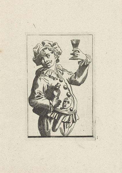 Curator: Before us is “Man met viool en roemer,” or “Man with Violin and Römer,” an engraving dating from the period of 1615 to 1726, attributed to Theodor Matham. It’s currently held here at the Rijksmuseum. Editor: What a boisterous character! He’s all diagonals and curves, from the sweep of the feathered hat to the swirling end of the violin’s neck. And look at that expectant, almost gleeful grin. Curator: Indeed! The artist skillfully uses the engraving technique to render light and shadow, drawing our eyes to the texture of the glass he’s holding and the sheen on his flamboyant plumage. Note the contrast with the stark crosshatching in the background, almost trapping the subject in our view. Editor: It’s as if he’s trying to charm the viewer, invite us to join the revelry, right? It also speaks to the rise of genre paintings during that era. The tavern scene or a depiction of merry music-making would be socially permissible themes. Did this work circulate widely? Curator: Precisely, the inscription at the bottom provides the invitation: "Je veux mourir au cabaret - Entre le blanc et le cleret.” Roughly translated as, "I want to die in the tavern between the white wine and the claret.” The inscription lends a further aspect, like so many prints, suggesting how the work’s political or moral impact would influence those that acquired it. Editor: It makes me wonder about Matham's intent. The subject seems a little coarse, a little too pleased with himself, doesn't he? And why depict someone clearly enjoying a less-than-genteel setting, knowing its place as a printed image in someone’s household? Is it an endorsement, or perhaps a satirical commentary on social excess? Curator: An excellent question! It's difficult to say definitively, but that tension is inherent to the visual language. Ultimately, it leaves it up to each individual viewer to determine for themselves. The strength of the print relies less on how and why, and relies more on the technical expertise the artist utilized, rendering a sense of tone throughout the cross-hatching. Editor: Absolutely! A study in texture and tonal contrasts that’s also a snapshot into the cultural world it reflects. Thanks! Curator: It was my pleasure!