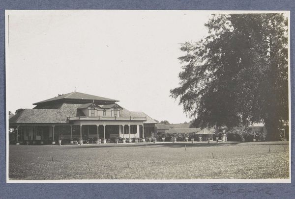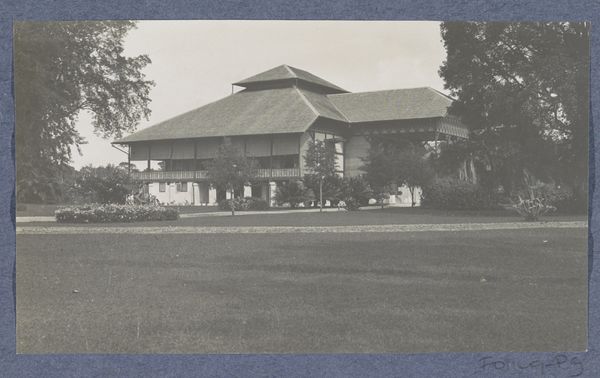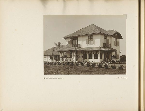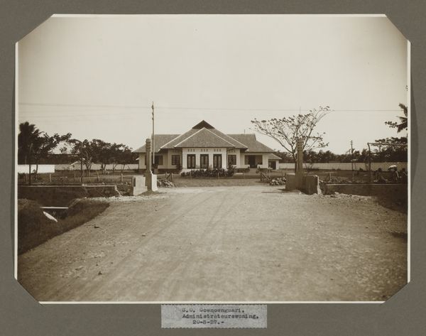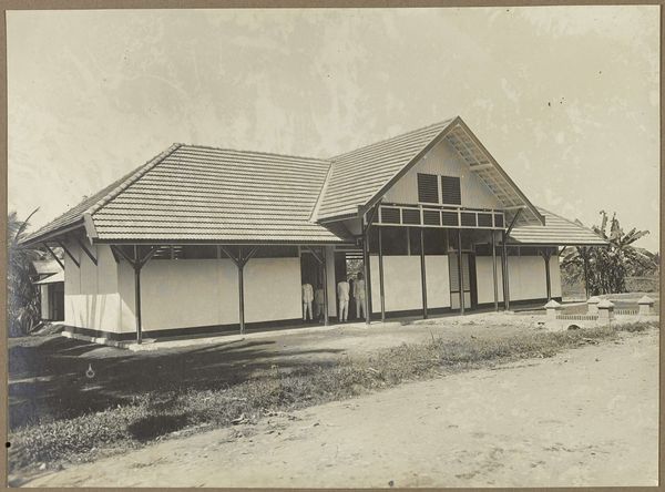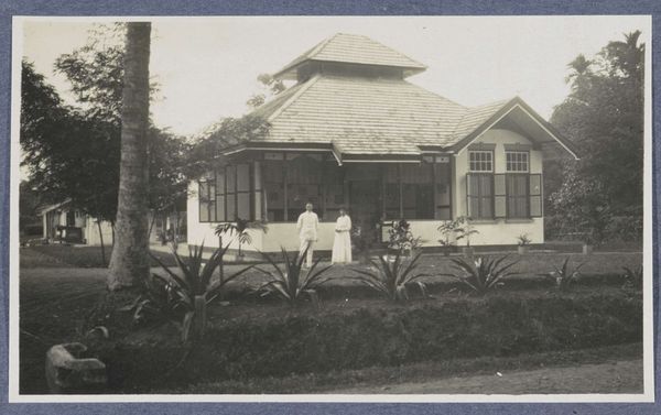 Curator: Looking at this vintage photograph, I'm struck by how effectively it captures a sense of both domesticity and the vast, unknown landscapes of the Dutch colony. What do you notice? Editor: Immediately, I sense a feeling of starkness, almost alienation, despite the presence of the house. It's the contrasting textures – the rough stonework, the smooth façade, the woman's slight figure that really stand out to me, what is her story here? Curator: This photograph is entitled "Edith Jetten voor het huis te Moengo," placing it in the period of 1925 to 1927. Editor: It reminds me a little of early modernist architectural photography. So, tell me more about the socio-political implications behind constructing such houses in Moengo, what was it all about? Curator: The photograph gives us an insight into the lives of Dutch individuals living in the then colony of Suriname. The modern house design and its presence in a tropical region evokes colonial aspirations, doesn't it? The geometric forms signify more than shelter, but are icons of Dutch governance and control. Editor: I agree completely; however, consider the composition: Edith herself seems almost spectral, diminutive even against this rigid background. Is she there to humanize the colonial presence, or does her image invite a deeper examination of women’s roles within colonialism's strict power dynamics? The image doesn't say it, but makes us want to ask it ourselves. Curator: Perhaps it speaks to both! Consider the deliberate act of photographing this scene; it underscores a narrative, embedding Edith, her house, and by extension, the Dutch colonial project into this specific landscape and our cultural memory. Editor: Yes, and what about the psychological effect of projecting a European ideal of “home” onto such a different place. Curator: Precisely! Through the window grids, or even the stone statues on the yard...these aren't arbitrary choices but rather symbolic reminders of heritage, identity, and ownership asserted within the colonial context. Editor: Looking at the social stratification and the building, what do you make of this photographic record as an example of early cultural Modernism? Curator: Modernism frequently sought to challenge existing structures, including societal ones, though even the best intentioned visions can still be vehicles for larger power structures. Now I find myself thinking about the visual legacy it has on today. Editor: It's remarkable how much depth a seemingly straightforward photograph can offer. I'll certainly leave today thinking more carefully about how visual histories shape colonial identities.