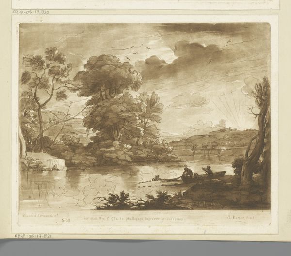 Editor: Here we have Richard Earlom's engraving, "Landscape with angel telling Hagar to return to Abraham and Sarah," dating to the late 1770s, housed at the Rijksmuseum. What strikes me immediately is how the light seems to emanate from the architecture on the hilltop, drawing the eye upwards. What do you see in this piece from a formalist perspective? Curator: From a purely formal perspective, one is immediately struck by the interplay of light and shadow which serves to guide the viewer's eye through the composition. The artist has used the brown ink to create depth, using varying tonalities, strategically placed to delineate form and create atmospheric perspective. The foreground figures, rendered in darker shades, act as anchors, juxtaposed against the lighter, almost ethereal rendering of the distant buildings. How do you think this contrast in shading impacts our perception of depth? Editor: It's interesting you point that out. I suppose the use of darker tones closer to the viewer tricks the eye into perceiving depth by exaggerating the foreground against the more faded background. Do you notice anything about the artist’s line work in conveying texture or emotion? Curator: The engraver's skill is undeniable. Observe the intricate network of lines which capture the rough texture of the trees, contrasting with the smooth surfaces of the distant architecture. It seems that the contrast creates an underlying tension: we observe that linear precision, strategically employed, contributes to the narrative suggested in the landscape. Ultimately, it transcends mere representation, and is elevated through meticulous attention to form, tone and line. Editor: That's fascinating, focusing on the pure composition has really opened my eyes to the artistic choices made here. Curator: Indeed, by dissecting the visual elements, we discover the artist’s mastery and elevate our appreciation for the art itself, quite apart from any other contextual understanding.