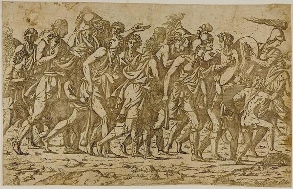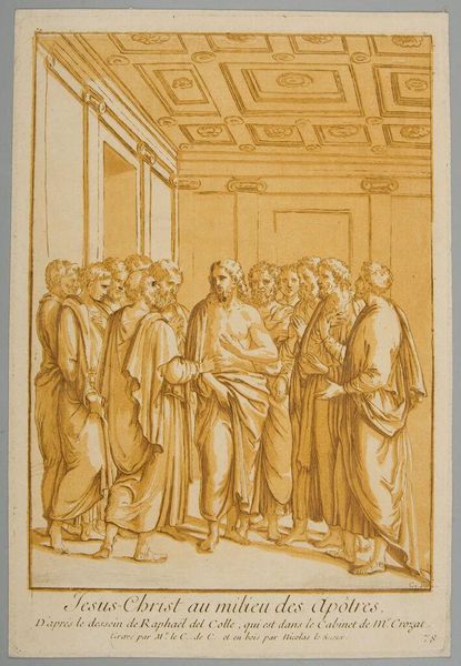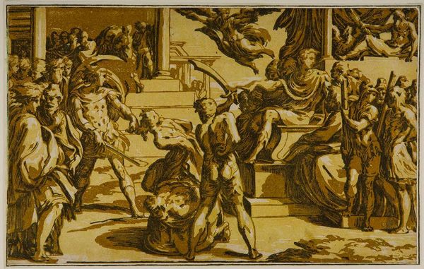 Curator: Ugo da Carpi's "Saint Peter Preaching" at Harvard Art Museums strikes me immediately with its rather somber tone. It's sepia-toned, like an old memory trying to surface. Editor: Indeed, the piece possesses a warmth, though I'm drawn to the technical aspects. It's a chiaroscuro woodcut—a fascinating method involving multiple blocks to create gradations of light and shadow. Curator: I find it’s less about the "how" and more about the "why." Peter seems caught in this intense moment, trying to connect with his audience, but there is this odd distance among the figures. Editor: But consider the labor involved! Each line, each shadow, carefully carved. It's not just a picture; it's evidence of process, of human hands manipulating materials to convey meaning. Curator: True, but that intentionality is what pulls me. Are we meant to feel connected or alienated? Maybe it's both—the push and pull of belief. Editor: Perhaps da Carpi was simply showcasing the possibilities of the printmaking process. Pushing the boundaries of what could be achieved through this relatively new medium. Curator: In the end, art is both a product of its time and something timeless. This piece, for me, resonates as a testament to that duality. Editor: Agreed. It's an intriguing intersection of faith, skill, and the evolution of artistic production.