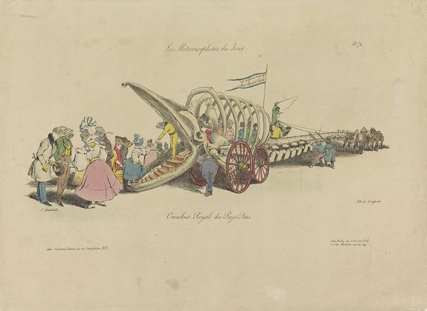This print was made anonymously around 1830, using the techniques of etching and hand-coloring. A fantastical depiction of a ‘steam whale,’ it shows the fusion of organic form and industrial prowess. Look at the steam-belching chimney stack, which rises from the whale’s back, contrasting with the skeletal ribcage that supports the soldiers on deck. This is no ordinary whale; it’s a war machine, complete with cannons firing from its mouth. The application of color brings this scene to life, with the bright yellow of the whale’s frame set against the blue uniforms of the soldiers. The print is a clear commentary on the industrial revolution and its impact on warfare. The labor of the soldiers is literally contained within the belly of the beast. It questions the cost of progress, and the blurring lines between technology, nature, and human life. It reminds us that even the most whimsical images can carry serious social and political weight.