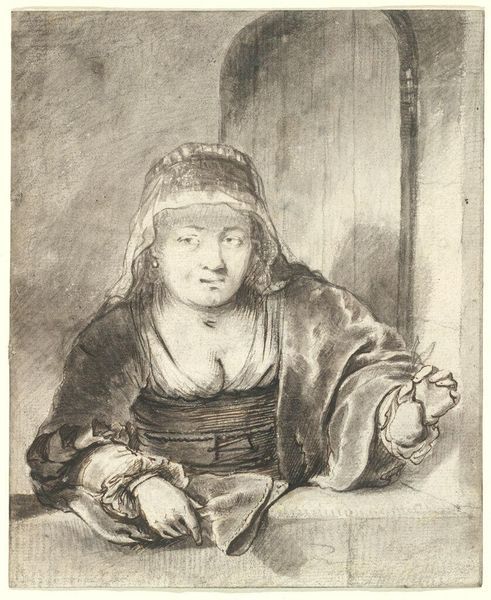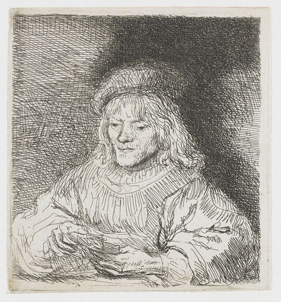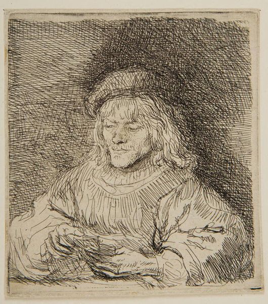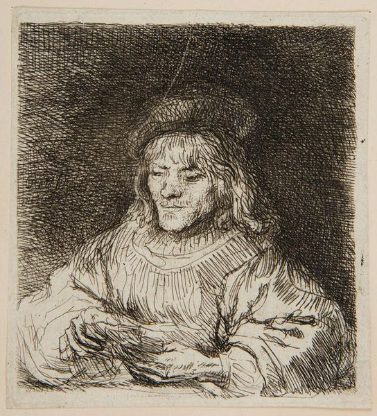 Editor: This print, "Kaartspeler" by Rembrandt van Rijn, is currently held at the Rijksmuseum. It's hard to say exactly when it was created but somewhere between 1641 and 1808. It appears to be an etching and a portrait. It feels incredibly intimate. How do you read it? Curator: The formal structure here is particularly compelling. Consider the density of the hatching, especially in the background, working as foil to the lightness of the figure. It's not just about creating form but constructing mood and isolating a sense of human interiority through contrast. Note, too, how line dictates form—the clothing and hair exist only as aggregations of lines that direct your eye and reveal shape. Editor: So you’re saying that Rembrandt uses the formal qualities of etching to really draw our attention and tell a story? Curator: Precisely. The absence of colour reinforces the structural elements. Consider how the diagonals in the folds of the sleeve counterbalance the more vertical lines of the torso, guiding the viewer’s gaze. Even the cap is critical to maintaining visual equilibrium. What might be lost without it? Editor: It probably wouldn't feel so grounded without it, like the figure could just float away. It's really fascinating to observe how formal features and shape work together. Curator: It’s through observing those visual elements and their relations that we begin to approach an understanding of the artist’s intention. Editor: I've never thought of approaching an etching this way before, focusing solely on the lines. Thank you for this interesting insight. Curator: The beauty of art lies within its complex structure, once revealed it becomes infinitely more appealing.