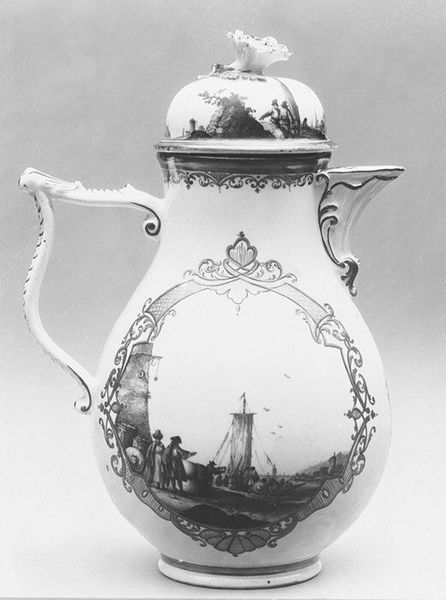 Curator: Before us, we have a "Milk Jug" created sometime between 1750 and 1770 by the Fürstenberg Porcelain Manufactory. You can find it on display at the Metropolitan Museum of Art. Editor: Well, my first thought is that it's remarkably austere for decorative art. I'm used to porcelain being ostentatious. This piece has this muted palette... monochrome really... despite the clear intention of luxury. Curator: It's more than just decorative; consider its use-value. This jug existed within very specific social structures. Milk, cream – these were commodities, tied to agricultural production, labour. This jug becomes a silent player in the dynamics of class and consumption. Editor: Exactly, porcelain itself was a coveted material. Note the clean lines, the high level of skill required for these fine decorations. I am curious how these images were made—did they apply decals on top of the fired porcelain or were they directly painted by highly trained laborers? The factory surely mass-produced these objects. Curator: Consider the maritime scene depicted – a ship, figures on the shore. These aren’t just pretty pictures; they evoke the vast colonial networks that shaped 18th-century life. Trade routes, exploitation, power dynamics – they're all implied here, especially when this item would be used to host gatherings, potentially normalizing those trades. Editor: It makes one question the value of something so functional being rendered into this object of desire. I would be really interested to know how its original commissioners or owners made sense of their everyday acts. Curator: Perhaps a constant reinforcement of their status? Using the jug would literally have them consuming the symbolic capital it represented. But looking closely we also see the detailed, handcrafted designs in decorative art, a kind of coded rebellion against mass production and industrialized labor itself. Editor: Ultimately, whether viewed as purely aesthetic or a cog in broader social forces, I find it telling that this Milk Jug speaks volumes about its era, especially given the limitations of a black and white medium that it carries. Curator: Absolutely. It is a powerful thing when an object that we still commonly have provides that sort of complex access to understanding life from centuries ago.