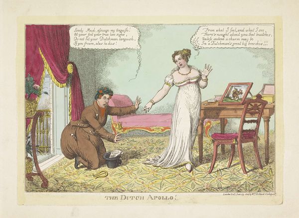Editor: "De Hollandse tol" – "The Dutch Toy," dating around 1814-1816, is a colored-pencil drawing now housed in the Rijksmuseum. There's a satirical, almost cruel wit about it, don’t you think? The way the woman's posed, whip in hand... What strikes you most about this piece? Curator: Cruel wit indeed! It fairly drips with the sarcasm of the time. Look at the upside-down figure in the portrait—a pointed dig, perhaps at a deposed leader? It's the age-old dance of power, wrapped up in the pretty bow of domestic life. The toy, representing Holland, is being spun and whipped, a metaphor for its political situation, caught between larger powers. But does the "toy" resist or comply? What’s *your* feeling? Editor: It feels a bit...passive, stuck in that top. There’s also something interesting about her gaze: She's whipping the toy, seemingly unconcerned about the hand offering a "broom." What do you think is the relationship here? Is this a criticism of someone's parenting, a power play? Curator: Precisely! It is complicated like a Regency minuet of political intrigue. The offer of the "broom" might symbolize another nation – perhaps England, offering a different kind of 'discipline.' And your observation about her gaze, the blank disconnect, reveals the apathy, maybe? Or a forced acceptance of the inevitable. Editor: So, beneath the colorful surface and caricature, lies a biting commentary on international politics? Curator: Exactly. This isn’t just a pretty drawing, it's a snapshot of a nation's bruised ego and the puppet masters pulling the strings, using color and character to make some serious political statements! Editor: It’s amazing how much can be read into what looks like a simple domestic scene. Thanks for making it clearer what's really being portrayed here. Curator: It has been a joy exploring with you the not so "simple" images within simple drawing!