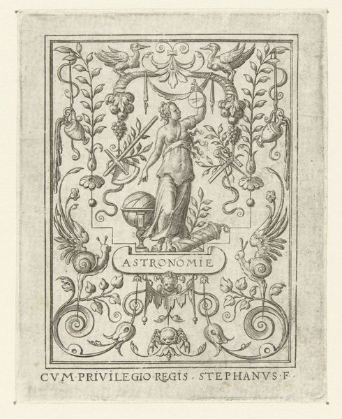 Curator: Before us, we have "Fysica," an engraving made with pen, dating back to the years 1528 to 1583, crafted by Etienne Delaune, currently residing here at the Rijksmuseum. It is exquisitely detailed. The line work is delicate, yet there's a profound sense of density to the whole composition. Editor: It feels ornate, yet restrained by its very order. I am immediately struck by the symmetrical composition. There's a very definite hierarchy established with the central figure. Curator: Yes, a female figure personifying Physics. She stands on a pedestal inscribed with her name, holding a vessel, perhaps an alchemical flask. Consider what Physics represented then. Not just the study of the natural world, but also the pursuit of hidden knowledge, often linked to alchemy. Notice, the implements of alchemy—the mortar and pestle. Dogs flanking it; do they represent fidelity, or something else? Editor: Fidelity, maybe caution? Dogs can be quite intuitive. There’s definitely a symbolic program operating here. What about the architectural framing of foliage and fantastical birds perched above? Curator: Ah, that’s classic Renaissance symbolism! The birds could represent intellectual aspiration or even the transformation sought through alchemical processes. The snail creeping below the bird. Even this juxtaposition carries weight: aspiration grounded by the slow, deliberate work required for real knowledge. The roses signify beauty of physics, and roses are a gift to scientists by the art in that epoch. The architectural flourishes could reference knowledge is not something from an amorphous existence. Editor: I like the balance between naturalistic details, such as the botanicals framing the central image, and the more stylized, allegorical figures. How would this engraving have functioned in its time? Curator: Prints like this circulated widely, acting as visual emblems of knowledge. They could have been collected by scholars, artists, or even used as models for other works. “Fysica,” in essence, became a portable idea, a concentrated symbol of the era's fascination with science and the natural world. It has stood the test of time, hasn't it? Editor: Indeed. Analyzing it today, we rediscover a visual record and echoes of lost epistemologies. The interplay of lines and symbols is remarkable; even now, you can unravel deeper contexts just by studying it.