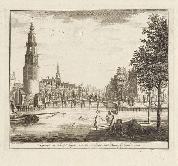 Curator: There’s a remarkable stillness to this image. It's titled "View of the Singel with the Jan Roodenpoortstoren in Amsterdam." We believe it dates from somewhere between 1710 and 1766 and the Rijksmuseum attributes it to an anonymous hand. The medium is engraving. Editor: Stillness, yes, but it's also unsettling. The tower looms, dominating the cityscape, and the lines of the engraving, though precise, have an almost claustrophobic quality. There’s something inherently imposing about that architectural structure and its relationship to the relatively diminutive figures crossing the bridge. Curator: The Jan Roodenpoortstoren served as a prison in Amsterdam. Consider the psychological weight that places on the composition. The Singel itself, a canal, forms a boundary, a kind of watery threshold overlooked by the stoic architecture. The artist captured more than just a physical space. Editor: Precisely! The canal also acts as a mirror reflecting the architecture; but also as a separator dividing what is being reflected in what the world perceives as “real." It creates layers upon layers of perceived reality; the bridge becomes a symbol as well for division, transition, connection, but also the limitation of crossing between spaces; thus underscoring that sense of confinement. Even the style - those dense, almost obsessive lines are integral to conveying this. The baroque elements with Dutch golden age qualities evoke this strange relationship that gives it depth of understanding. Curator: And observe how light plays in this setting; you get a glimpse into the daily life but also an inherent darkness; creating an aura around the figures and architecture. I think what’s so compelling is that the scene suggests a narrative far beyond the depiction. We are invited to contemplate themes of confinement, freedom, the social contract, and of course, history itself. Editor: It’s the very definition of spatial storytelling; a meticulously rendered stage set prompting profound reflections. A very intriguing visual statement indeed.