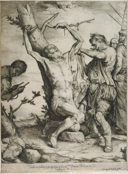 Curator: This etching is Jusepe de Ribera's "The Martyrdom of Saint Bartholomew," housed here at the Harvard Art Museums. Editor: It's unsettling—that raw, exposed flesh rendered with such graphic detail. You can almost feel the excruciating pain. Curator: Ribera was deeply influenced by Caravaggio, and you see that stark realism here. But there's also the historical context: the Counter-Reformation embraced such depictions to inspire religious fervor. Editor: The labor involved in creating this print—the careful etching of lines to build tone and texture—is impressive. The way he uses line to suggest the stretching of skin is particularly effective. Curator: Absolutely, the image clearly had a public role in its time, reinforcing faith through dramatic, almost brutal, imagery. Editor: Looking at the social conditions in Naples during Ribera's time, this imagery also speaks to human suffering and the body, especially the laboring body, as a site of pain and resilience. Curator: A powerful testament, then, to the intersection of faith, politics, and artistic expression. Editor: It’s a striking demonstration of how materiality and social context intersect in the making of meaning.