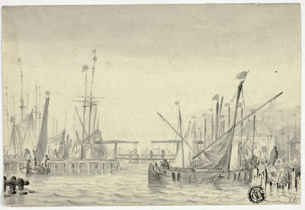 Editor: Here we have "To kôlede skibe," or "Two Keel-Hauled Ships," an etching by Reinier Nooms, dating sometime between 1623 and 1664. It’s a chaotic scene, with several ships and a small boat filled with figures. One ship appears to be capsizing. What catches your eye when you look at this print? Curator: The keeling of a ship wasn't just an image; it was a ritual. It was a violent act meted out on the water, using the water itself. Think of the psychological implications of submerging a body under the waves – a symbolic death and potential rebirth, dictated by the harsh justice of the sea. Editor: Rebirth? It seems brutal. Curator: The ship itself carries immense symbolic weight, doesn’t it? It represents not only trade and exploration, but also the fragility of human endeavor against the power of nature, or even the subconscious. Are these ships simply being punished or cleansed? Consider also the little boat. Are they there for rescue or enforcement? Editor: I hadn't considered the double meaning. So the ship being keelhauled represents both punishment and…spiritual cleansing? Curator: Potentially. This was the Dutch Golden Age. Consider the relationship of humans to mercantile exploration and also how maritime power defined Dutch identity. These images weren't merely documentation. Nooms was a sailor himself, after all. Editor: That context is fascinating! Now the scene feels heavier, fraught with meaning. Thanks for showing me how the cultural memory influences its interpretation. Curator: And thanks to you, I’m rethinking what “maritime power” meant, if rituals of cleansing were needed alongside feats of trade and naval might.
