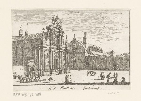 Curator: Welcome. Today we're looking at Israel Silvestre’s "Gezicht op de kerk van Saint-Sulpice," or "View of the Church of Saint-Sulpice", an etching dating from somewhere between 1631 and 1661. Editor: The texture of this etching, it has a very delicate, almost lace-like quality. I notice the careful details; the shading on the figures in the square really makes you see the variety of clothing styles, it almost captures the material itself, not just the representation. Curator: Silvestre was master of topography, capturing these urban views as almost social documents. Prints such as these circulated widely, shaping perceptions of Parisian life and architecture across Europe. The Saint-Sulpice depicted here stands not just as a religious building, but also as a civic symbol within a rapidly changing city. Editor: Absolutely. And you can see that material culture in how the labor is represented too. Etchings like this required skilled craftsmanship, and it speaks to a culture that valued fine detail and the ability to reproduce images for a wider audience. It's also worth noting how printmaking allowed for the mass consumption of art and ideas. How many impressions were produced? It tells you so much about social reach of Silvestre. Curator: The accessibility is key. While commissioned by elites, these images shaped public consciousness. Notice how the church grounds aren’t just empty space. They are filled with different social classes going about their lives. The architecture serves almost as a backdrop to everyday interaction and urbanity. How these images ended up on the walls of burghers would say a lot about it’s appeal. Editor: I agree. The composition guides our eye towards understanding these social relations, capturing the burgeoning capitalism in the 17th century, almost unknowingly! And the etcher is present; he put so much labour in that plate, to then be circulated through various merchantile means! Fascinating indeed. Curator: I find the political implication truly resonant when looking back at its socio-historical placement, allowing us glimpses into 17th-century Paris. Editor: And the etcher too! This view encourages us to examine not just the grandeur of the architecture but its position in a chain of socio-economical elements.