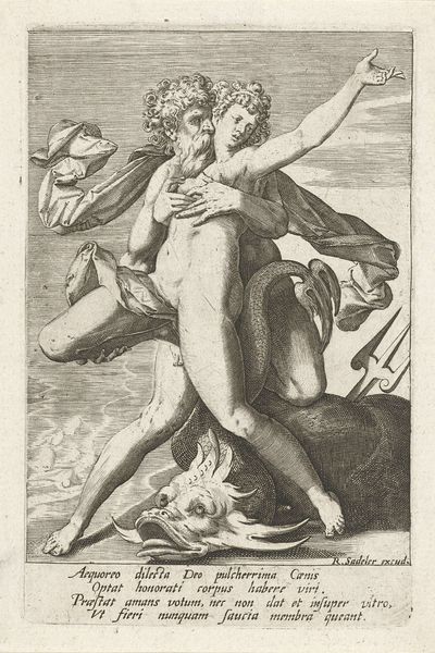 Johann Sadeler I created this print, Neptune and Caenis, around 1580. Notice the dramatic, swirling composition dominated by the figures of Neptune and Caenis. Sadeler uses intricate lines to define their musculature and the undulating forms of the sea creatures, creating a sense of dynamic movement. The visual structure here is not just about aesthetic appeal; it reflects a deeper engagement with classical mythology and its reinterpretation during the Renaissance. The embracing figures, the contrasting textures of skin and sea, and the upward thrust of Caenis's arm all contribute to a complex interplay of power, desire, and transformation. Sadeler’s manipulation of line and form serves to destabilize fixed meanings, inviting us to consider the fluid boundaries between human and divine, male and female. Consider how the engraving technique itself, with its precise, controlled lines, underscores the tension between order and chaos, mirroring the thematic concerns of the artwork. This formal quality is not merely decorative; it is integral to the print’s larger cultural and philosophical discourse.