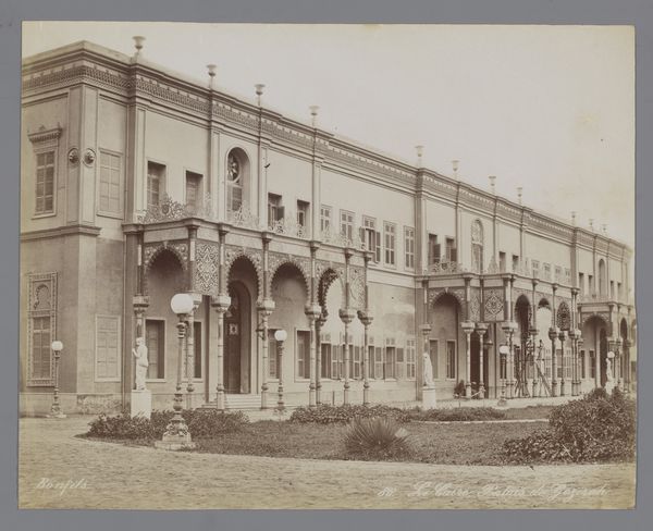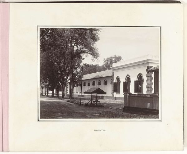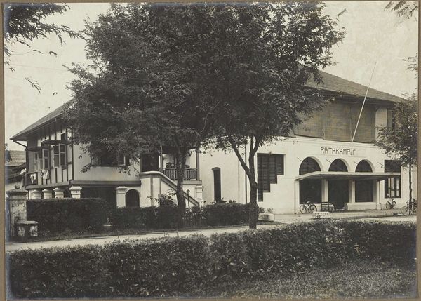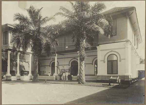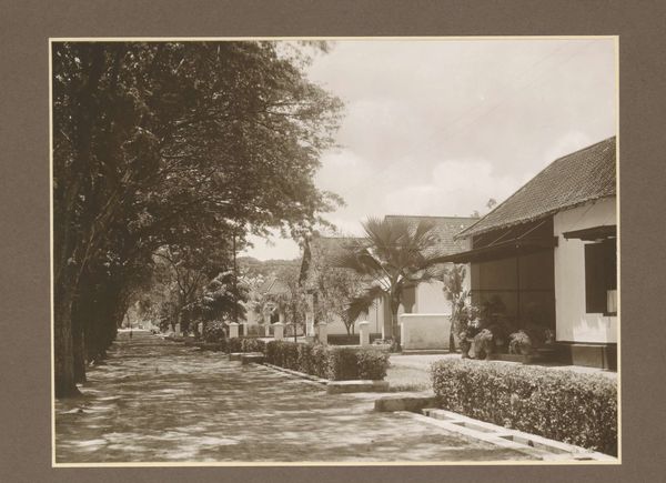 Editor: Here we have a gelatin-silver print from between 1925 and 1930 by Isken: *Fabrieksgebouw met de ingang van het laboratorium van suikerfabriek Meritjan te Kediri op Java*, or, *Factory with the entrance to the laboratory of the Meritjan sugar factory in Kediri, Java*. There's a stark kind of beauty in this industrial landscape. What jumps out at you? Curator: It speaks of ghosts, doesn't it? Shadows and whispers caught in silver. I see a carefully constructed facade – almost neoclassical in its bearing - trying to civilize the industrial beast within. Did you notice the playful dance of the trees framing this rigid architecture? Almost as if nature is conspiring to soften the edges of progress. Editor: I hadn’t really considered the contrast, but now that you mention it, it's pretty obvious. Do you think that the trees and landscape could suggest any particular agenda of the artist? Curator: Perhaps Isken sought a visual reconciliation, a dialogue between man and nature at a time when industry was aggressively reshaping the world. Java, in that period, was undergoing intense transformations, grappling with the fruits—and costs—of modernization under Dutch colonialism. Makes you wonder, doesn’t it, what was actually being ‘processed’ at the Meritjan sugar factory: sugar cane or colonial ambition? Editor: That gives the image an interesting edge that I wasn’t seeing before. So it's less about the architectural details and more about these broader questions that it hints at? Curator: Exactly! Art often invites us to wander beyond the literal. These historical photos can act like time capsules, no? Filled with unanswered questions, and layered perspectives just waiting to be rediscovered. Editor: Thanks, that was such an illuminating take on it. Curator: My pleasure. Always a joy to dust off the echoes of history.
