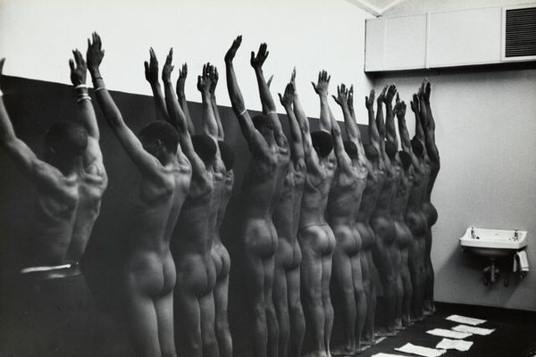 Curator: Here we have Marina Abramović's "Balkan Erotic Epic," dating to 2005. What are your immediate thoughts? Art Historian: My breath just caught. The open landscape, that ring of women, their faces tilted toward the sky... It evokes a feeling of ancient ritual, something primal and connected to the earth. Curator: Indeed. The composition strikes me with its stark simplicity. The women, arranged almost geometrically, create a powerful horizontal line bisected by the kneeling figure in white. The palette, restricted to whites, blacks, and the greens and grays of the landscape, enhances this sense of austere solemnity. Art Historian: Absolutely. That austere palette focuses the eye on the symbolism. The exposed breasts, hands placed over the heart...it's a powerful, if ambiguous, statement about female vulnerability and strength. The contrasting figure on the ground – cloaked, head covered – introduces another layer. Is she the supplicant, or the observer? Curator: I would say the repetition itself creates meaning. Note how Abramović uses the grid-like arrangement of figures to flatten perspective, reducing each woman to an element in a larger visual system. Their individuality is secondary to the collective impact. Art Historian: But isn't individuality the point? Balkan culture is steeped in folklore and complex rituals around sexuality and fertility. The image feels connected to that tradition—a modern reinterpretation of age-old symbols of womanhood and the earth’s bounty. These women evoke an ancestral link to nature, perhaps offering a commentary on cultural erosion or resilience. Curator: A valid reading. Yet, I maintain that regardless of specific cultural references, the image gains its force from formal choices: the contrast between the figures and the bleak sky, the careful orchestration of bodies in space, and the photograph’s stark overall affect. These are crucial in determining meaning, wouldn't you agree? Art Historian: Oh, certainly. It’s the interplay that truly matters. By setting up formal echoes and ruptures, Abramović allows those Balkan symbols to vibrate with contemporary significance. What resonates is that dialogue between cultural memory and the very intentional, self-aware act of constructing art. Curator: Precisely. It's a testament to the image's powerful impact. Art Historian: Agreed. One cannot easily dismiss this one!