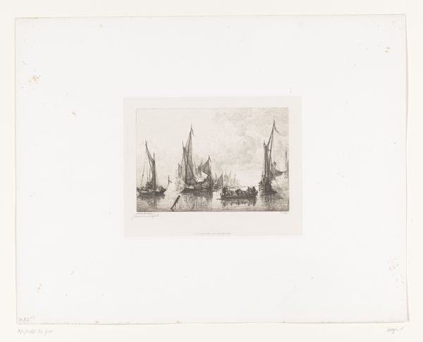 Curator: William Unger created this engraving, “Zeilschepen en roeiboten op rustige zee,” or “Sailing ships and rowing boats on a calm sea,” sometime between 1861 and 1889. It's now part of the Rijksmuseum collection. Editor: It’s like a whisper of a scene. All grayscale gradations creating a dream-like harbour… or maybe it’s more about memory? It feels incredibly ephemeral. Curator: Interesting you say "memory." Boats, throughout history, haven't only carried people and goods. In the collective psyche they also carry aspirations, the promise of escape, and, crucially, connection across water. This image taps into those ancestral journeys. Editor: Precisely! Unger uses engraving so subtly—look at the meticulous, feathery lines of the rigging. There's a conscious aesthetic choice happening; each mark works with tonal gradations to create a specific atmosphere, one which doesn’t shout… it contemplates. It’s more Romanticist style, I guess. Curator: You've nailed it. The Romantic movement embraced emotion and subjectivity. Sea journeys symbolize not just physical movement, but inward reflection as well as longing. Unger’s vessels become metaphors. Each detail—the arrangement of the boats, the calm water, the misty sky—speaks to both inner states and outward reaching possibilities. It speaks to human endeavors in that period of history and to genre painting. Editor: This engraving seems almost shy, in its complexity and monochrome aesthetic… despite all that open water and skyscape. There’s a humility here, the absence of loud colors contributes greatly to its pensive nature. I think it makes a bold statement. Curator: Perhaps its strength is its subtlety. This harbor scene, in all its monochrome glory, becomes a looking glass reflecting our hopes, memories and yearning. Unger successfully invites us to embark on that voyage through time, where image, icon, memory, and symbol all combine. Editor: Yes, an ode to understatement in its very thoughtful technique and its careful Romanticism, which serves to heighten that visual poetry.