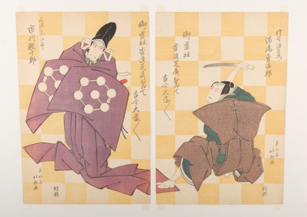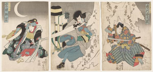 Editor: So, this is a woodblock print titled *Kabuki Scene at Kumagai's Camp* from the play *The Chronicle of the Battle of Ichinotani*. It was created sometime between 1801 and 1821 by Utagawa Kunisada. There's definitely a theatrical energy to it, and I'm curious about what's happening in this scene and its cultural background. What do you see in this piece? Curator: The floating world jumps into the wrestling ring, doesn't it? I find these Kabuki prints so deliciously artificial. Each pose is a universe of gesture and symbol, not a slice of reality but a performance. The exaggerated makeup, the dramatic fan, it’s all a language, not unlike a highly stylized dream. It's from a play about the battle of Ichinotani, but notice how the individual figures don’t interact directly? Have you ever felt utterly alone despite being in the middle of a dramatic scene? Editor: I see what you mean about the "stylized dream". There is something really staged about it, almost like snapshots from different scenes pasted together. Is that common in this style of *ukiyo-e*? Curator: Precisely! These prints often functioned as celebrity snapshots, promoting popular actors and plays. Kunisada here isolates and emphasizes specific moments and star personalities for marketing’s sake! I imagine it like today's social media hype machine: immediate, splashy, and very self-aware. Doesn’t it also remind you of the fleeting beauty that life always offers? Editor: Absolutely! Knowing it’s related to promotion changes how I see it, like a movie poster but with so much more detail and craftsmanship. Thanks for pointing that out! Curator: The pleasure is mine. We came a full circle! Who knew art promotion can become art?