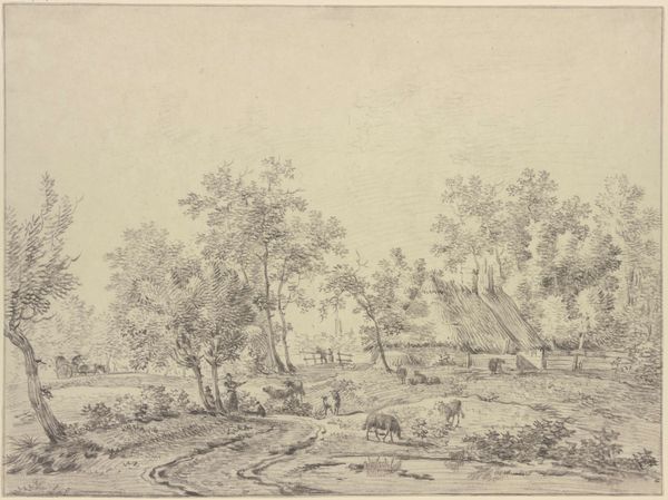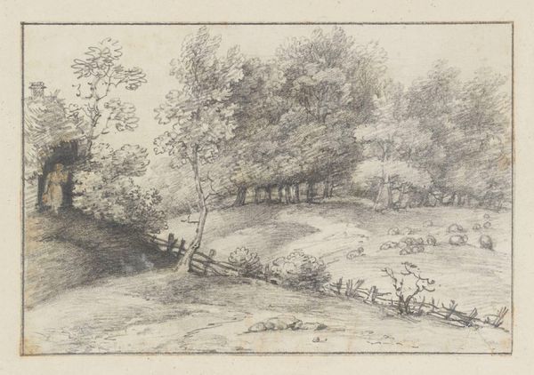 Curator: This delicate etching, whose title is not definitively known, is the work of John Baptist Malchair, born in 1731. It resides in the Tate Collections. Editor: It's quite small, and very textural. It almost looks like a quick notation, the way the trees are rendered. A fleeting impression of the countryside. Curator: Malchair was known for his landscape drawings, often depicting the changing face of Oxford and its surroundings. This piece reflects that interest in local scenery. Editor: I see the labor in the landscape – the fence, presumably erected by someone. How does that influence the reception of the natural world here? Curator: It speaks to the complex relationship between humanity and nature, a subject explored by artists throughout the 18th century. Editor: It's compelling to consider the physical act of etching, the materials used to translate the landscape onto the plate. It brings a focus on both the landscape and its human impact. Curator: Indeed, it provides us with much to think about in how we view art's relationship to the world around us. Editor: A fine landscape, it leaves one pondering what Malchair thought about the society reflected in it.