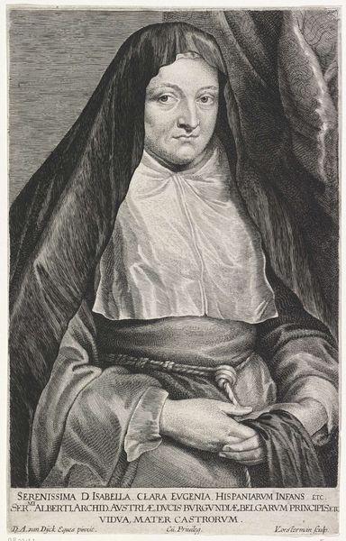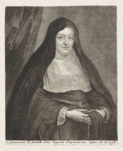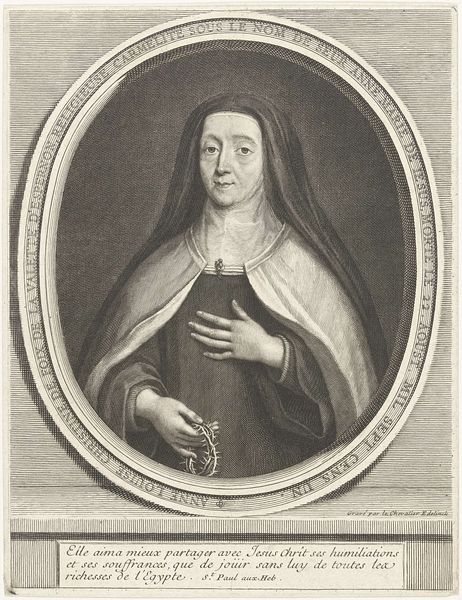 Editor: This is a print from the late 1670s, titled "Portret van Clara Maria van de passie," created by Albertus Clouwet. It's an engraving depicting a nun, framed by an oval wreath. The level of detail, achieved just through lines, is remarkable! What symbols or meanings do you see embedded within this portrait? Curator: Immediately, the image evokes ideas of piety and the structured life. Consider the very deliberate choices in composition – the oval wreath, a classic symbol of eternity and completion, framing her. The lettering below provides biographical information that invites further reflection, wouldn’t you agree? Editor: Definitely. It seems almost like a biographical monument. Does the choice of flowers have a significance? Curator: Likely. Floral symbolism was incredibly important. We’d have to examine which flower it depicts. Further exploration into Clara Maria’s life and the Carmelite order, its cultural history, the visual symbolism would likely reveal why Clouwet framed her with a particular flower. Are you sensing connections between her, the image, and the viewer across time? Editor: That's a great point. It does seem designed to create a connection between Clara Maria's piety, her earthly presence represented in the portrait, and the viewer's own contemplation. Curator: Precisely! The print functions as a tool for meditation, an aide-memoire as it were, of the enduring ideals that Clara Maria represented to her community, her faith made visual. This creates a potent cultural memory. Editor: So, beyond just a portrait, it's almost a reliquary in print form? Curator: Yes! By using established iconographic traditions, the artist sought to embed her within a system of shared meaning, one that hopefully transcended her death and spoke to the continuity of belief. It gives one pause. Editor: I agree, considering it through the lens of cultural memory, I can now recognize layers of intended significance I hadn’t seen at first. Thank you!