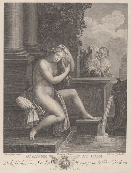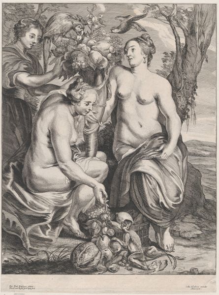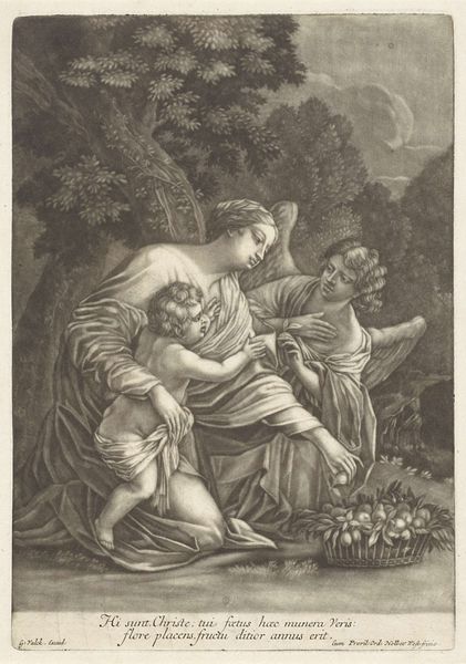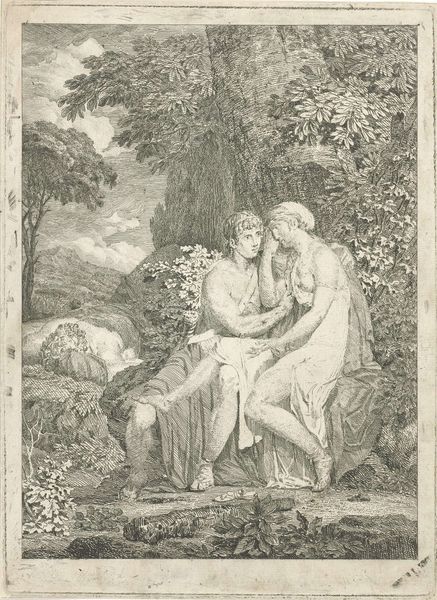 "Vertumnus en Pomona" is an engraving by Gerard Valck, created around the late 17th to early 18th century and held at the Rijksmuseum. The print shows a scene dominated by the interplay of light and shadow, structuring the composition in a way that draws our eyes across the figures and the landscape. Note how Valck uses contrasting tones to define forms and create depth, enhancing the tactile sense of skin, fabric, and foliage. At the center, the embrace of Vertumnus and Pomona isn't just a narrative moment; it's a study in contrasts—the smoothness of skin against the roughness of the surrounding nature. This tension reflects broader themes of transformation and deception, central to the story of Vertumnus who transforms himself to win Pomona's affection. The statue and the cherubic fountain behind the pair add levels of meaning about the artificiality and playfulness in the lovers' interaction. The deliberate arrangement of elements and the tonal gradations serve as a reminder that art is a construction and a complex arrangement of signs.