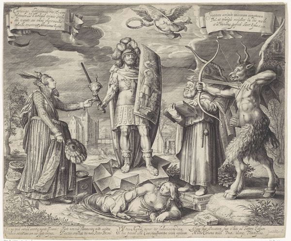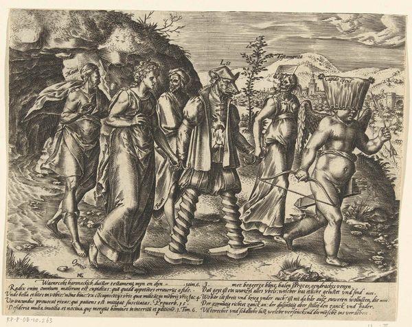 This engraving, *Huwelijk tussen Arbeid en Vlijt,* was created by Philips Galle in the late 16th century. The stark contrast between the dark lines and the light background immediately catches the eye, creating a dramatic effect. The composition is structured around a central group of four figures set against a distant landscape. The figures are arranged symmetrically, with the two central characters, Labor and Timor Domini, joining hands. On either side, we see the figure of an ass with tools balanced by Diligentia. This symmetry, however, is disrupted by the diagonal lines of the landscape, creating a dynamic tension. Galle uses line and texture to differentiate the characters, emphasizing the muscularity of Labor and the ornate robes of Timor Domini. These sartorial differences can be understood as signs which give meaning to the figures. The overall effect is to elevate labor and diligence to a religious level, reinforcing contemporary ideas that persistent work leads to knowledge. The marriage of labor and diligence suggests a union that generates wisdom. Galle's use of line and form invites us to think about how work and faith are intertwined, reflecting cultural values that privilege knowledge gained through industriousness.