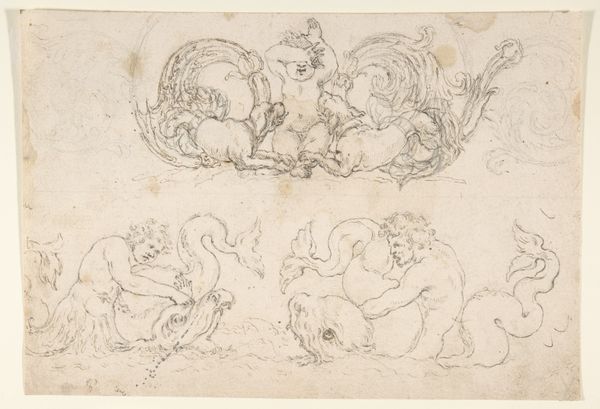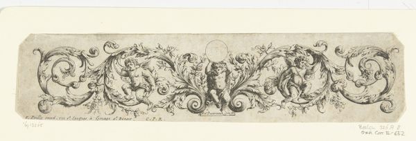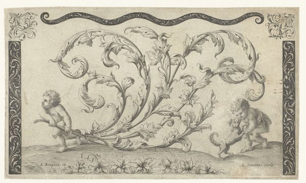 Curator: Looking at this, I immediately sense a whimsical lightness, an almost ethereal quality achieved through delicate lines. Editor: That's a lovely observation. This ink and engraving drawing is entitled "Amor standing on a shell surrounded by ornament." It was created between 1683 and 1733 and is attributed to Bernard Picart. Curator: The depiction of Amor, the god of love, standing on a seashell feels loaded, a symbol of the commodification of desire within social hierarchies of that period. The ornamental details are, for me, somewhat gaudy and call attention to themes of excess that were symptomatic of the aristocracy. Editor: You make a great point regarding excess, and such ornamentation served very real functions, illustrating the wealth, taste and power of its patron, acting as a type of political propaganda. These objects reinforce established social narratives that can perpetuate inequalities and exclusion. Curator: Exactly. I'm intrigued by how Picart’s placement of Amor challenges traditional ideals. We might explore his potential subversion or endorsement of prevalent socio-economic norms through artistic choices, by centering questions about gender, social standing, and economic agency within this visual allegory of love. Is love truly available for everyone, or just the wealthy and powerful? Editor: That’s a pertinent inquiry, though keep in mind Picart was often commissioned by wealthy patrons, so while subversive readings are always possible, institutional support from dominant social players frequently dictated parameters for artistic production. The Rijksmuseum context is also meaningful because its collection practices influence public perception of this work by legitimizing the history represented by it. Curator: True, it calls us to reflect on who gets to shape and decide cultural representation, how institutional frameworks can sometimes skew inclusivity. How can we be certain of how diverse narratives get represented? Editor: Reflecting on these complexities is valuable because considering multiple viewpoints promotes better understanding and encourages more critical art appreciation today. Curator: Indeed, it reminds me that art is never truly separate from the broader forces and ideologies within which it emerged, which encourages dialogue across diverse contemporary lenses.