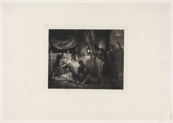 Curator: The play of light immediately captures my attention—it’s soft, almost like peering through a nostalgic veil, wouldn't you agree? Editor: Precisely. The composition, while seemingly simple, relies on a carefully calibrated distribution of light and shadow, creating a domestic narrative and engaging spatial construction. Let's delve into this interior. What we have here is Adolphe Lalauze's "Interieur van een huis", or "Interior of a House," dating somewhere between 1848 and 1875. This work utilizes printmaking techniques, specifically etching and engraving. Curator: Engraving? Like memories etched into the mind. And that figure standing in the doorway, bathed in light... It feels like a moment captured mid-breath, an echo of daily life, but also of mystery, almost waiting, dont you agree? Editor: That liminal figure introduces an interplay of public and private spheres and engages in visual tension—an investigation of boundaries and viewership. It is interesting how Lalauze has built all this on Realism as a style. See how space recedes back, almost drawing you in. Curator: Reality softened and made intimate. I can feel that quiet almost as if I have a memory associated with it. Perhaps a loved one waiting? And maybe the light feels special simply because light itself it’s an impression that creates emotions. And the way everything's captured adds the idea of stillness that seems very deep, as if nothing will move again, suspended! I'm starting to sound crazy haha Editor: On the contrary, such observations offer fertile ground for interpretation, yet it is crucial to engage the semiotic system informing the work. Take for instance how Lalauze uses linear configurations to depict the intricate details of the textile of clothing, the subtle gradations in tonality through a varied array of light and shades… each stroke guides the viewers through a system that constructs meaning on every layer. Curator: It’s amazing what light, a needle, and a bit of metal can conjure together—emotions, stories, echoes from the past. You are really the one teaching here… This makes me wanna ask, if this work could talk to you right now what you would want to ask? Editor: An incisive question that I think brings forward my conclusion. I see in this engraving that a space speaks its cultural language through the material world. And to achieve that effect is truly commendable.